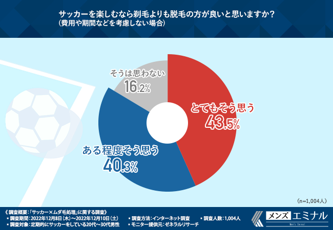 そこで、「サッカーを楽しむなら剃毛よりも脱毛の方が良いと思いますか?(費用や期間などを考慮しない場合)」と質問したところ、『とてもそう思う(43.5%)』『ある程度そう思う(40.3%)』『そうは思わない(16.2%)』という回答結果になりました。