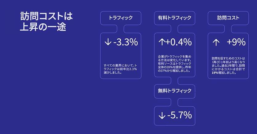 この原因は オーガニック・トラフィックの減少、有料チャネル(特にペイドソーシャル)への依存の増加、そして最も重要なこととして、顧客の高まる期待に応える完璧なデジタル体験の提供という課題が重なりあっていることが挙げられます。