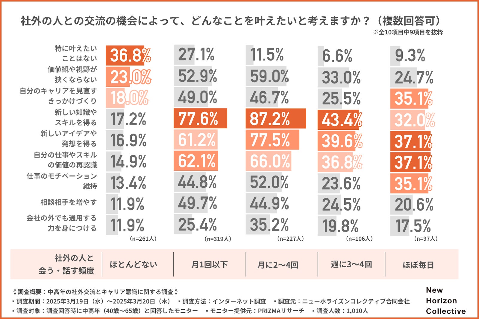 ニューホライズンコレクティブ合同会社(本社:東京都港区、代表:山口 裕二、野澤 友宏)は、中高年(40歳〜65歳)を対象に、「中高年の社外交流とキャリア意識」に関する調査を行いました。