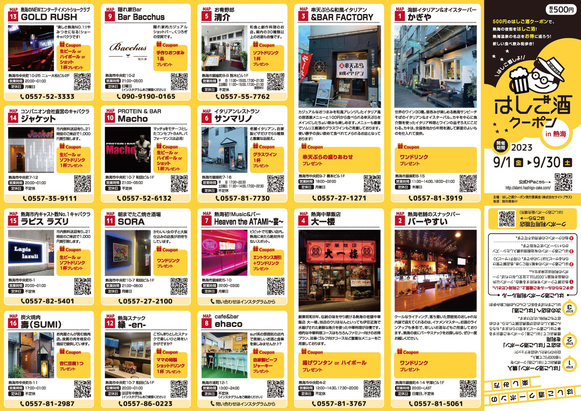 9⽉1⽇(⾦)からテストマーケティングが始まっている熱海の街を飲み歩く企画「はしご酒クーポン」。熱海市や関係組合などから後援を頂いた事で10⽉1⽇(⽇)から本格スタートいたします!
