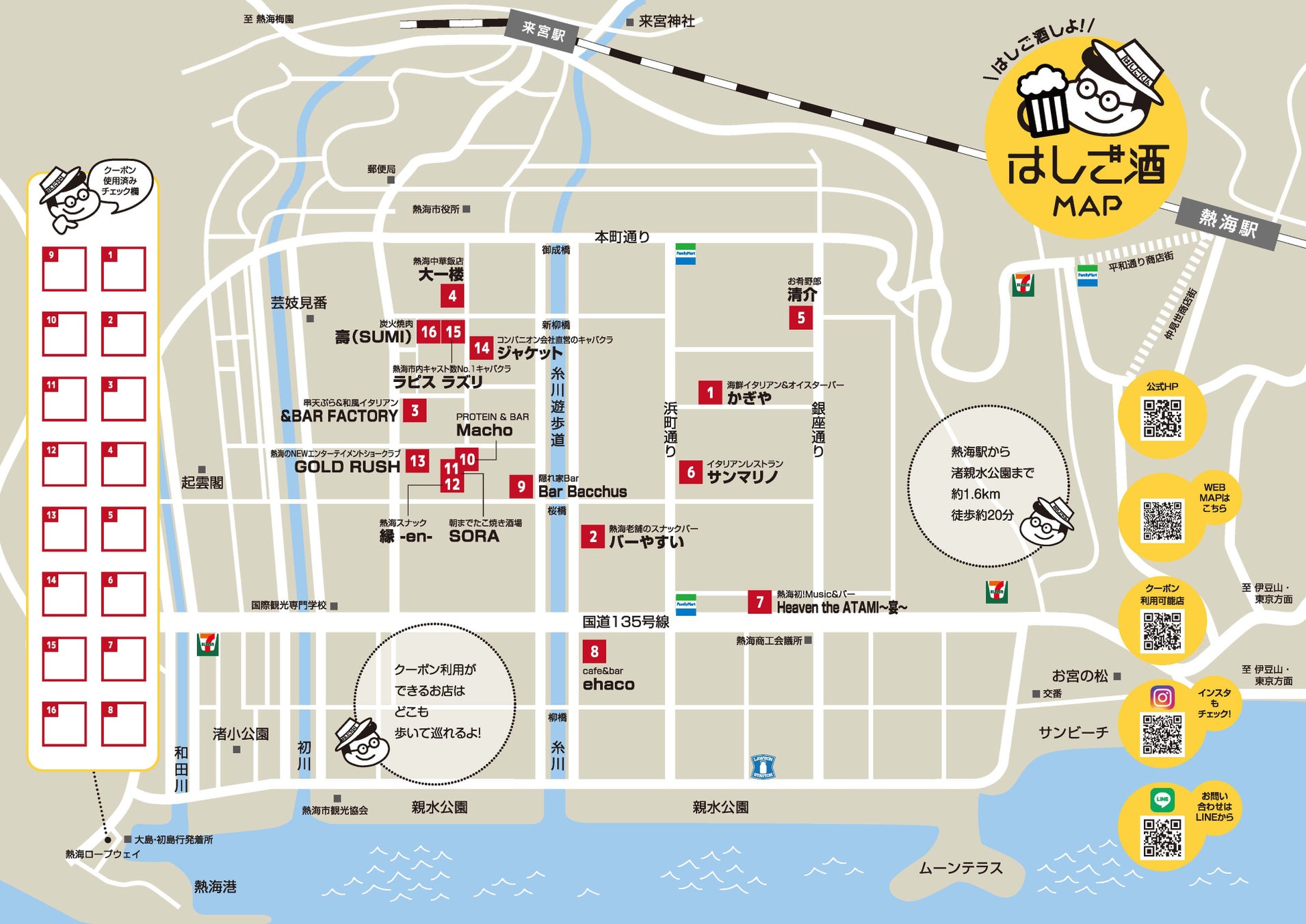 1年を春夏秋冬の4つのシーズンに分けて、この様な企画では珍しく年間通じて開催!提携飲食店の参加やクーポンの見直しなどをしながら、主に熱海の「夜の街」の魅力を伝えるのが「熱海はしご酒クーポン」。飲⾷店や飲み屋が掲載されているマップとクーポン付きの冊⼦を、提携している飲⾷店や近隣の宿泊施設にて税込500円で販売しており、観光客や近隣の地元民は、「はしご酒クーポン」に掲載されている飲⾷店などに⾏くと、サービス(おつまみ1品やドリンク1杯などのサービス)が受けられるという企画。