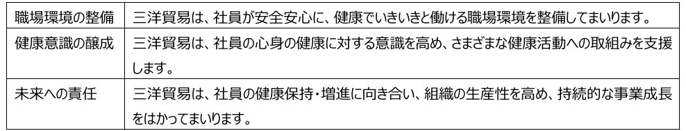 また、社員の健康管理を経営上の重要事項と捉えています。心身ともに健康な社員が、高い意欲を持ち、新たな価値を生み出すことにより、商材発掘と安定供給を通じて、心豊かな暮らしの提供に貢献するという考えに基づき、「三洋貿易健康経営宣言」を定めております。