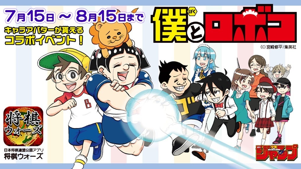 HEROZ株式会社(以下、HEROZ)は、将棋アプリ「将棋ウォーズ」において、「週刊少年ジャンプ」連載中の人気漫画『僕とロボコ』との初コラボイベントを、2024年7月15日(月)から2024年8月15日(木)の期間、実施します。