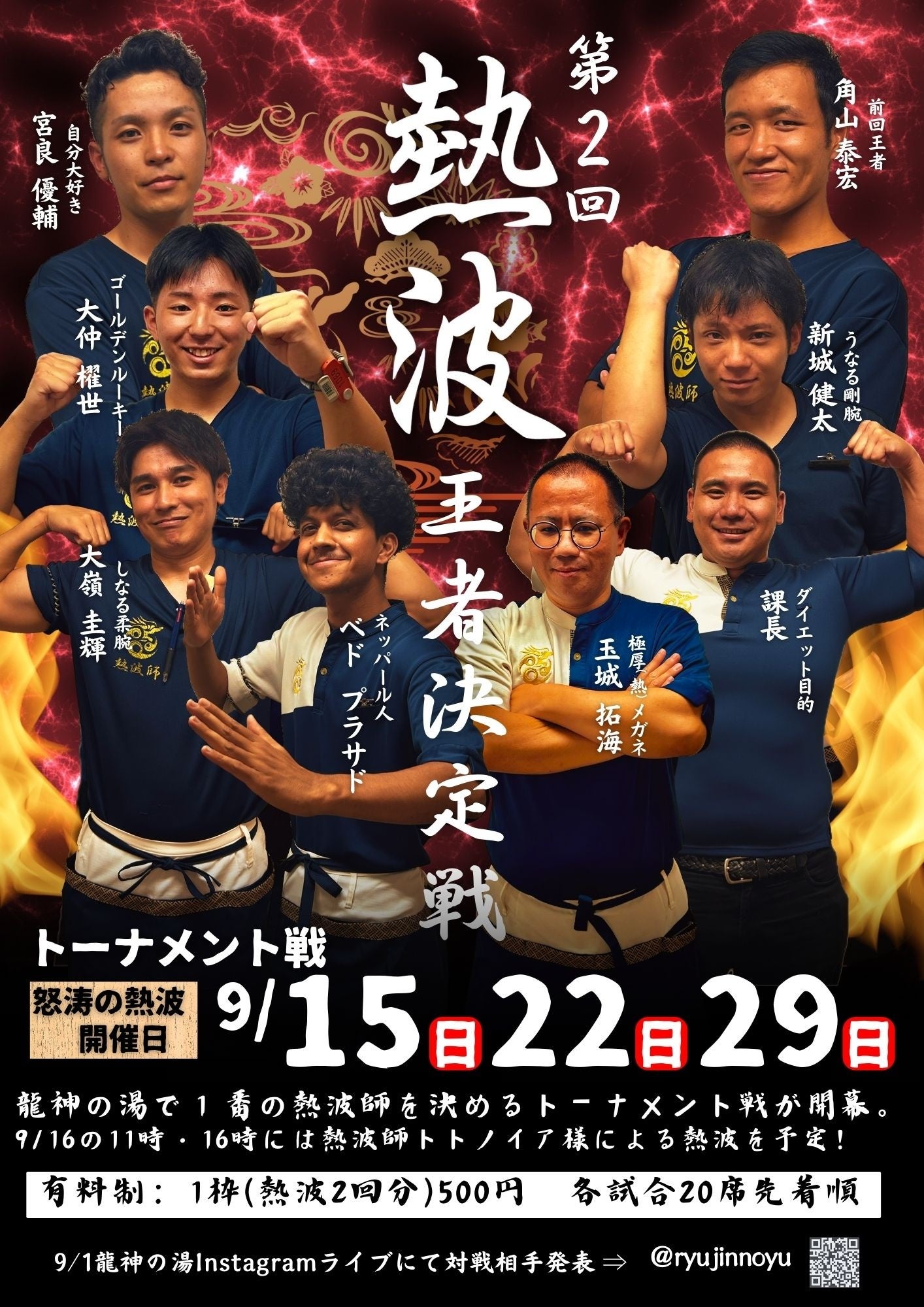 5名の熱波師がしのぎを削った『第1回 熱波王者決定戦(6/16~30)』では、投票総数999票と多くのお客様にご参加いただき、熱い戦いが繰り広げられました。第2回開催を熱望する声も多くいただき、その期待に応えるべく、今回は参加熱波師を8名に増員!トーナメント方式を導入し、さらにパワーアップした熱波イベントを開催いたします。龍神の湯自慢の熱波師たちがその技術とパフォーマンスを競い合い、沖縄で一番熱い風を皆様にお届けします。