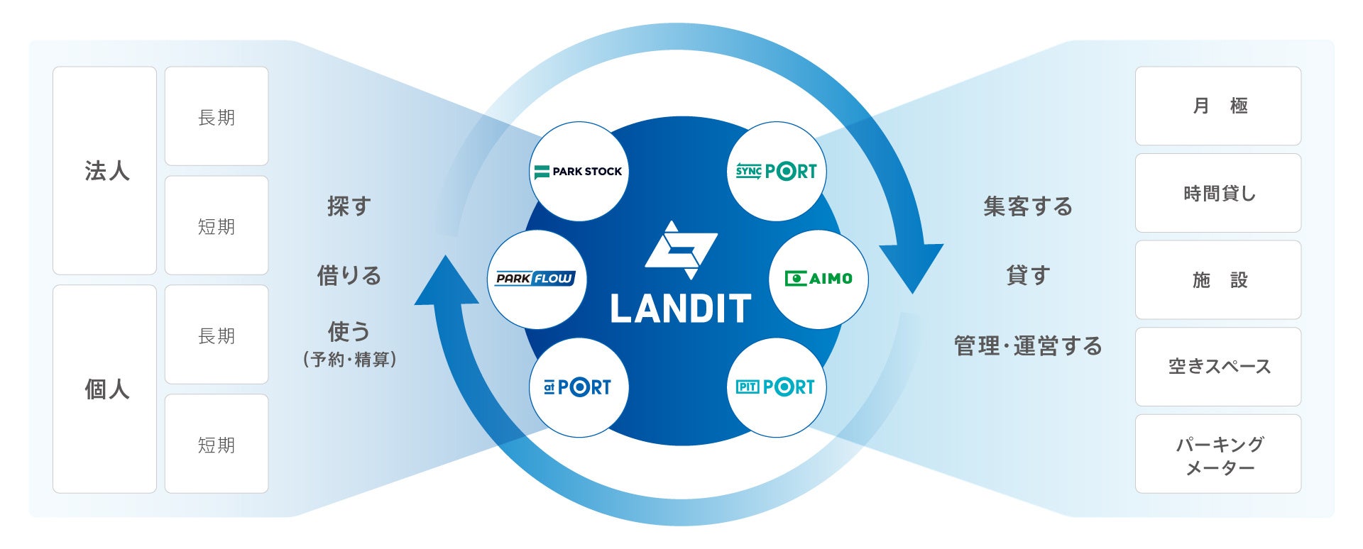 ランディット株式会社は、「世の中に最適と豊かさを提供し、人々の営みに欠かせない存在に」をミッションに、衛星×IoT×AI×データにより、幅広いソリューションを提供するスタートアップ企業です。「at PORT」をはじめ、定期駐車場管理サービス「SYNC PORT(シンクポート)」、予約式駐車場サービス「PIT PORT(ピットポート)」、AIカメラによる運営システム「AIMO Parking(アイモパーキング)」、月極駐車場のオンラインマーケット「PARK STOCK(パークストック)」、コインパーキング、商業施設駐車場などの検索・精算アプリ「PARK FLOW(パークフロー)」、リアルタイム遠隔臨場「LiveBiz(ライブビズ)」等のサービスを展開しています。