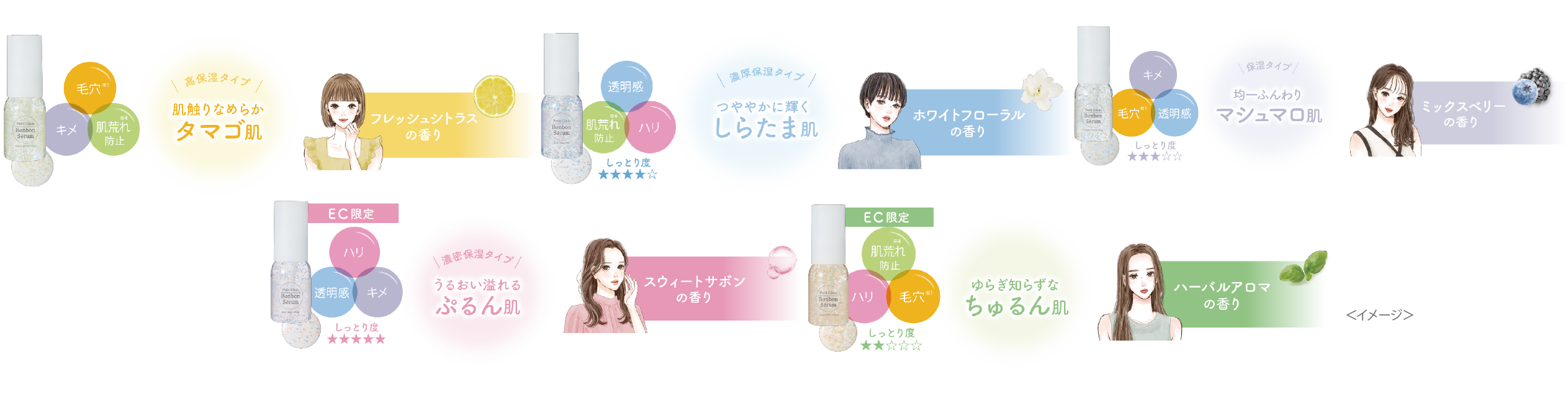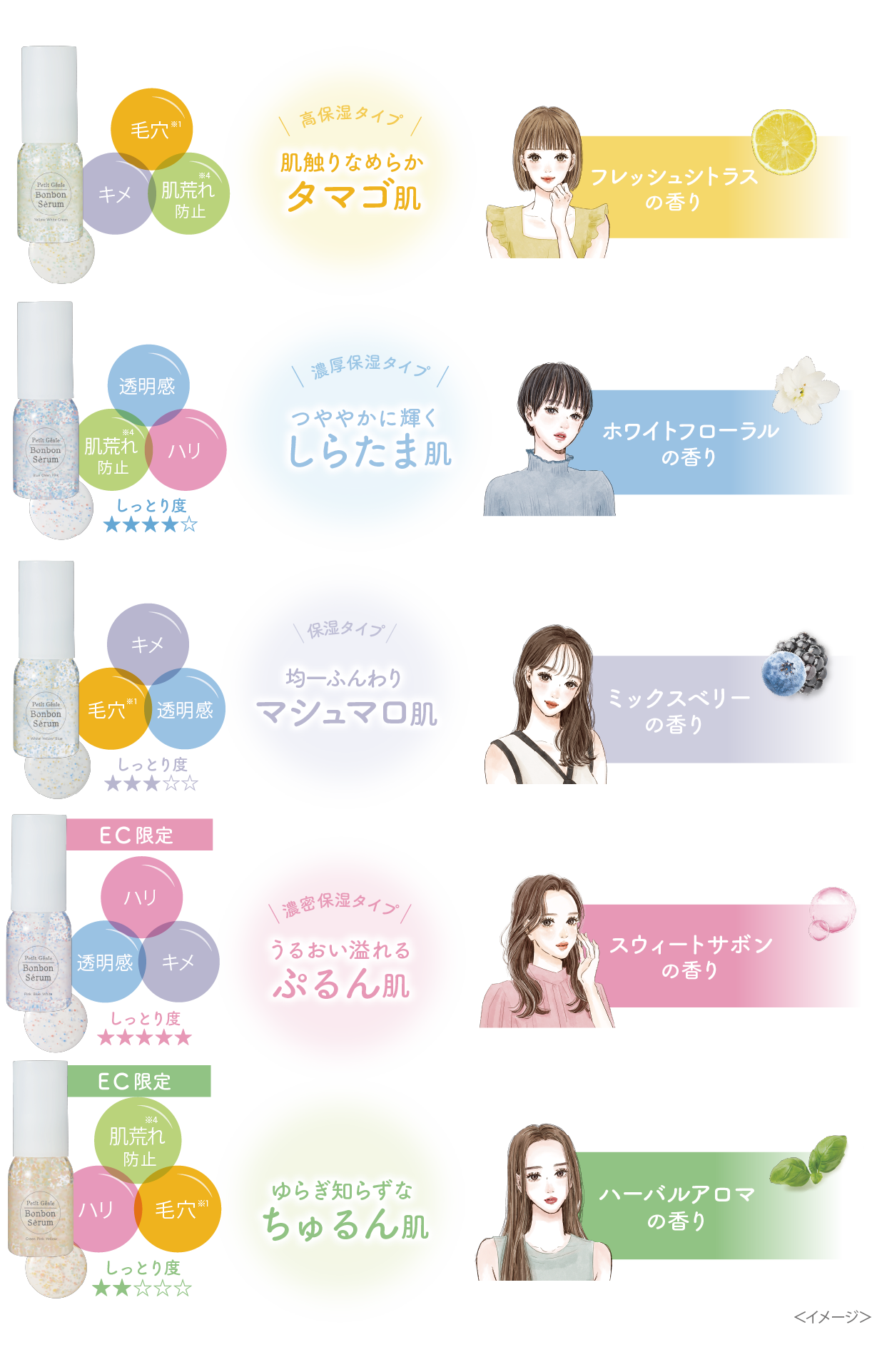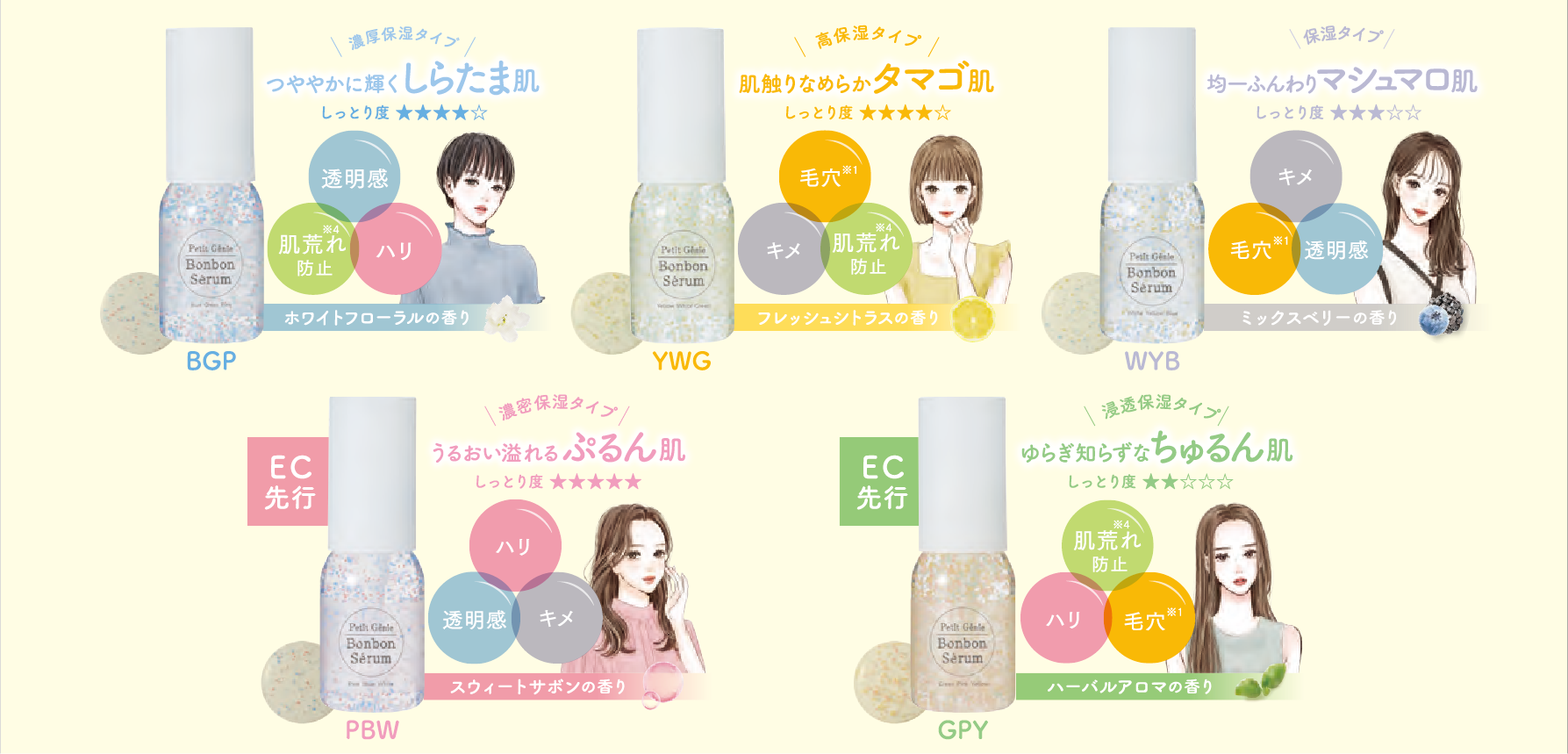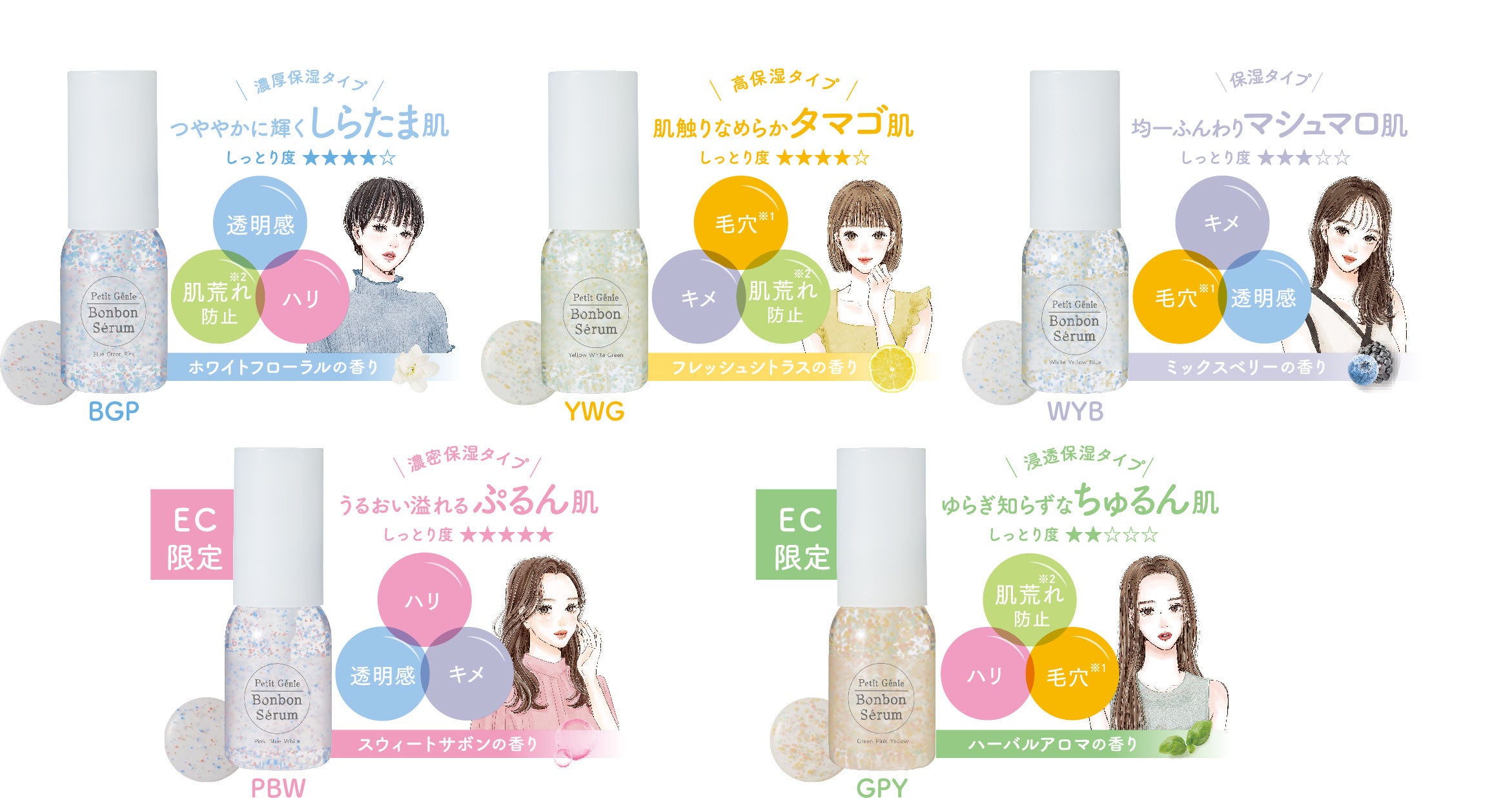 ◆5種類の中から、肌悩みにピッタリな1本を選べます。PBW、GPYはEC限定販売となります。