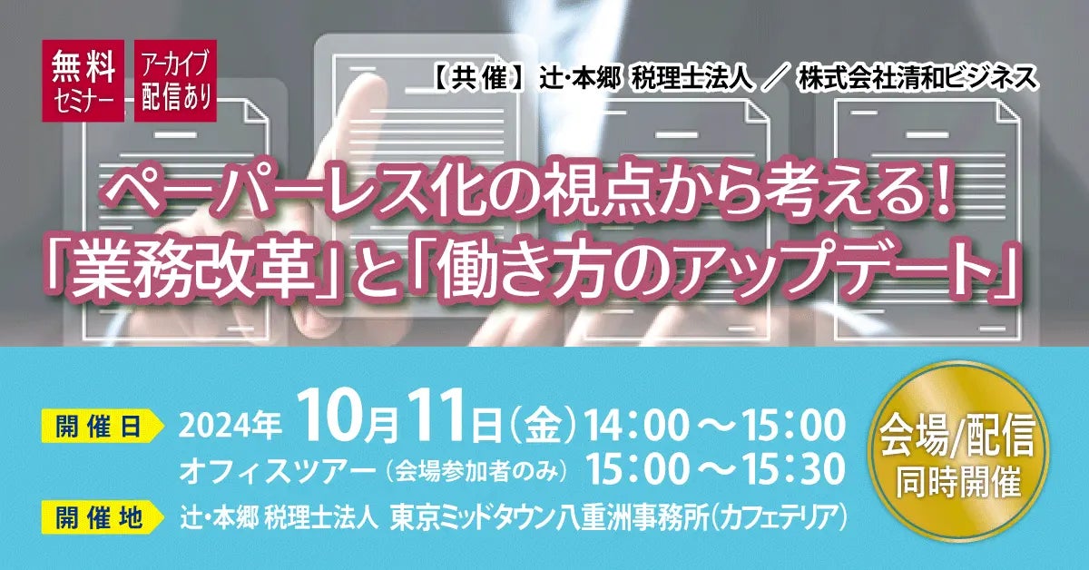 株式会社清和ビジネス(本社:東京都中央区、代表取締役社長:勝本浩史)は、辻・本郷 税理士法人(本社:東京都新宿区、理事長:徳田孝司)と2社共催で「ペーパーレス化の視点から考える!『業務改革』と『働き方のアップデート』 」セミナーを会場/配信同時開催いたします。オフィス環境を重視している求職者が増加しており、働く環境も経営戦略の一つになっています。本セミナーでは、魅力的なオフィスにするための第一歩である「ペーパーレス化」について解説します。また、当日視聴が難しい方のために10月18日(金)11:30~10月24日(木)17:00の期間でアーカイブ配信を行います。