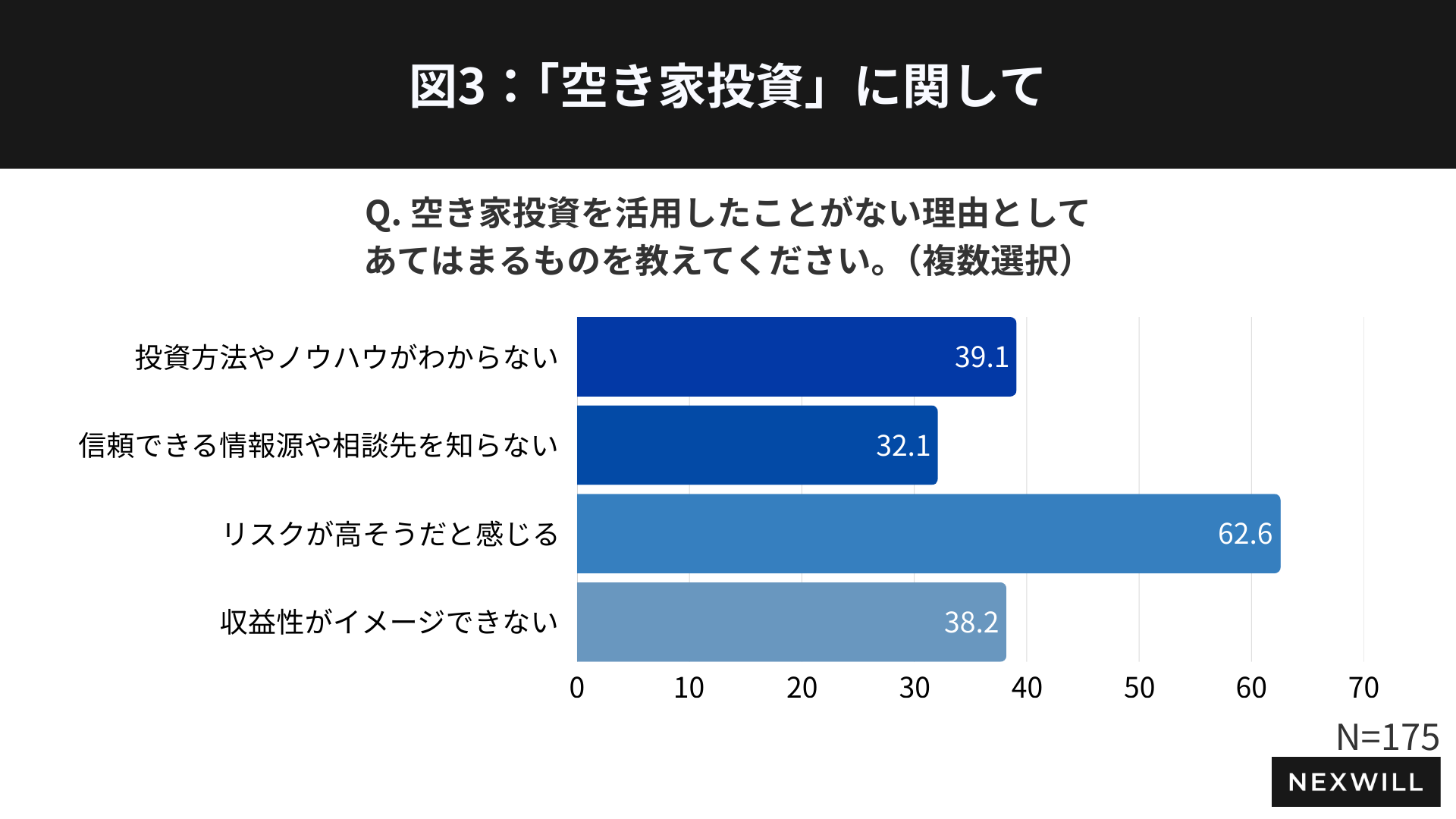 「知っているが、活用したことがない」と回答した115名に理由を尋ねたところ、「リスクが高そうだと感じる」(62.6%)が最も多い結果となりました(図3)。次いで、「投資方法やノウハウがわからない」(39.1%)、「収益性がイメージできない」(38.2%)、「信頼できる情報源や相談先がない」(32.1%)と続きました。リスクへの先入観に加え、具体的な情報不足や相談先がない点が、空き家の利活用をためらう要因になっていることが分かります。