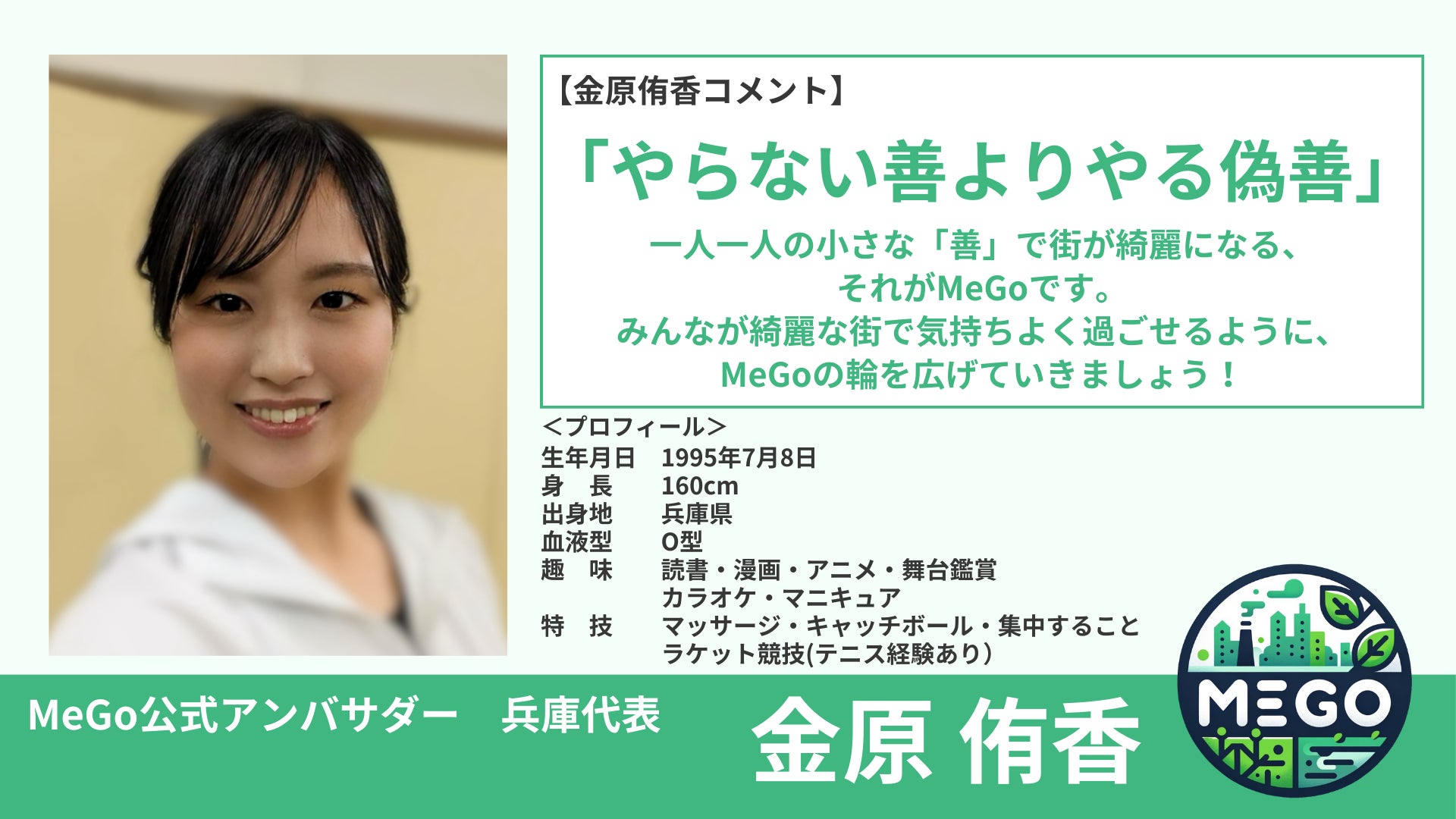 このたび、金原侑香は自身の出身地である兵庫県のクリーン活動をより盛り上げるべく、「MeGo」(ミーゴー)の公式アンバサダーに就任いたしました。