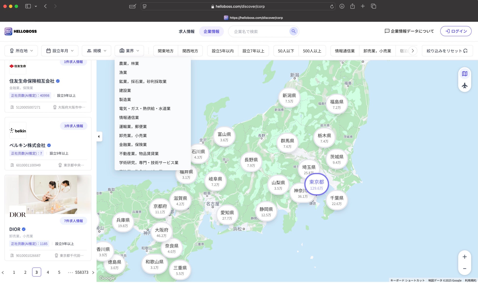 併せて新しく公開されたWEB版『HelloBoss』から「HelloData」の無料体験が可能になりました。日本全国の企業数と正社員数を地域別、設立別、規模別などから検索できるほか、マップ上からもわかりやすく表示され、「HelloData」でどんなデータが網羅されているか簡単に体験できるようになります。