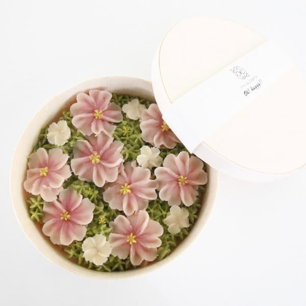 いちご餡を敷き詰めた上に餡で絞った桜と小花をあしらった、ギフトや手土産にぴったりなおはぎです。