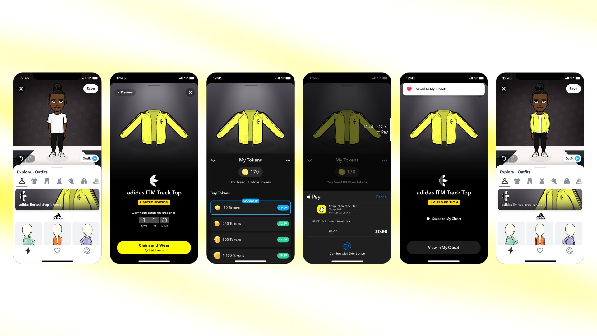 トップスを着用するには、自分のBitmojiをタップし、アディダスのBitmojiバナーをタップします。このトップスは、250 Snapトークン(Snapchat内のトークンショップで購入可能)で購入できます。