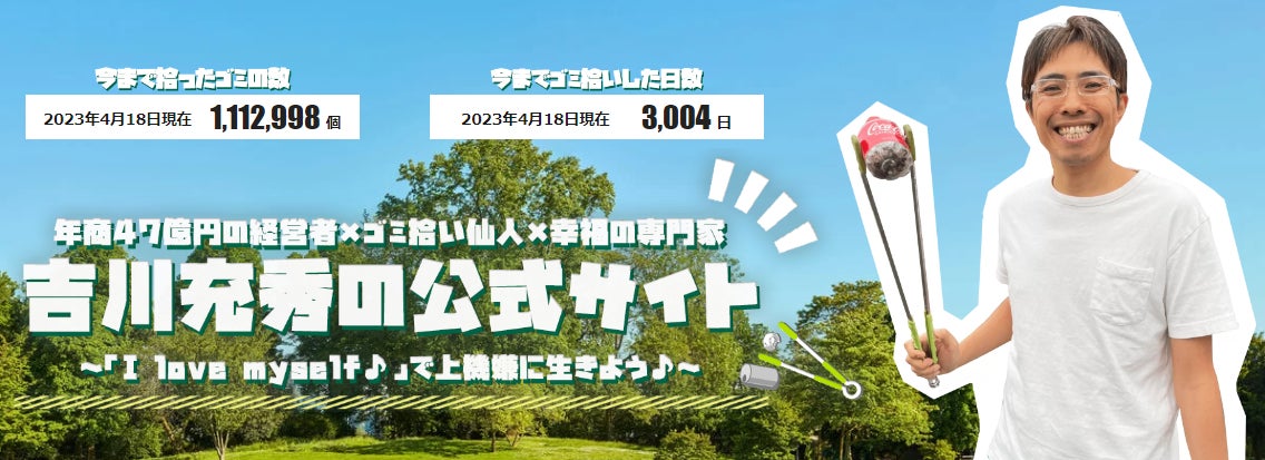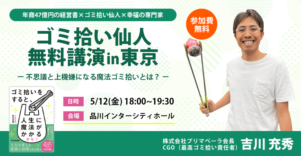 ゴミ拾い111万個突破!『ゴミ拾い仙人 無料講演in東京』5月12日㈮開催「年商47億円の経営者」×「ゴミ拾い仙人」×「幸福の専門家」初の東京講演!先着5社様限定の取材可能メディア参加枠 募集開始!