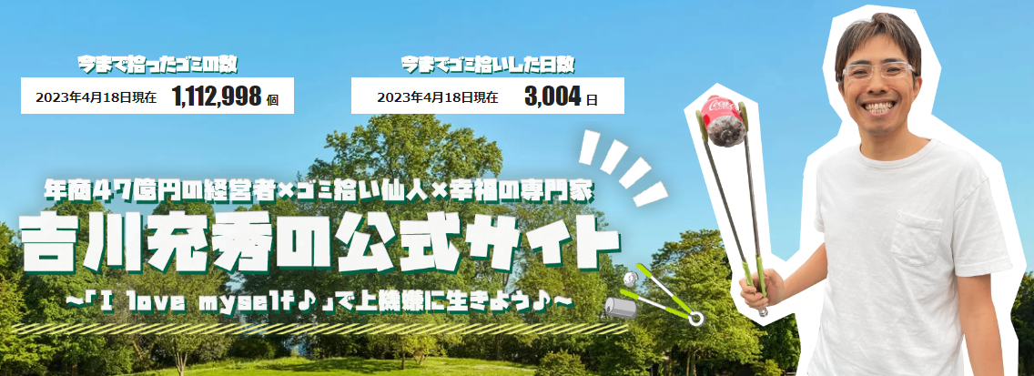 ライフワークはゴミ拾いであり、これまで国内外で拾ったゴミは100万個超。地元では「ゴミ拾い仙人」として知られ、ゴミ拾い仙人として地元太田市の清水聖義市長との面会も果たす。このゴミ拾いこそが、自身の成功の最大要因であることから、ゴミ拾いの魔法の伝道師として、現在、全国で講演活動を行っている。本の出版直後にネットニュースやテレビ出演で大きな話題になるなど、注目を集めAmazonや大手書店でランキング1位を獲得した。