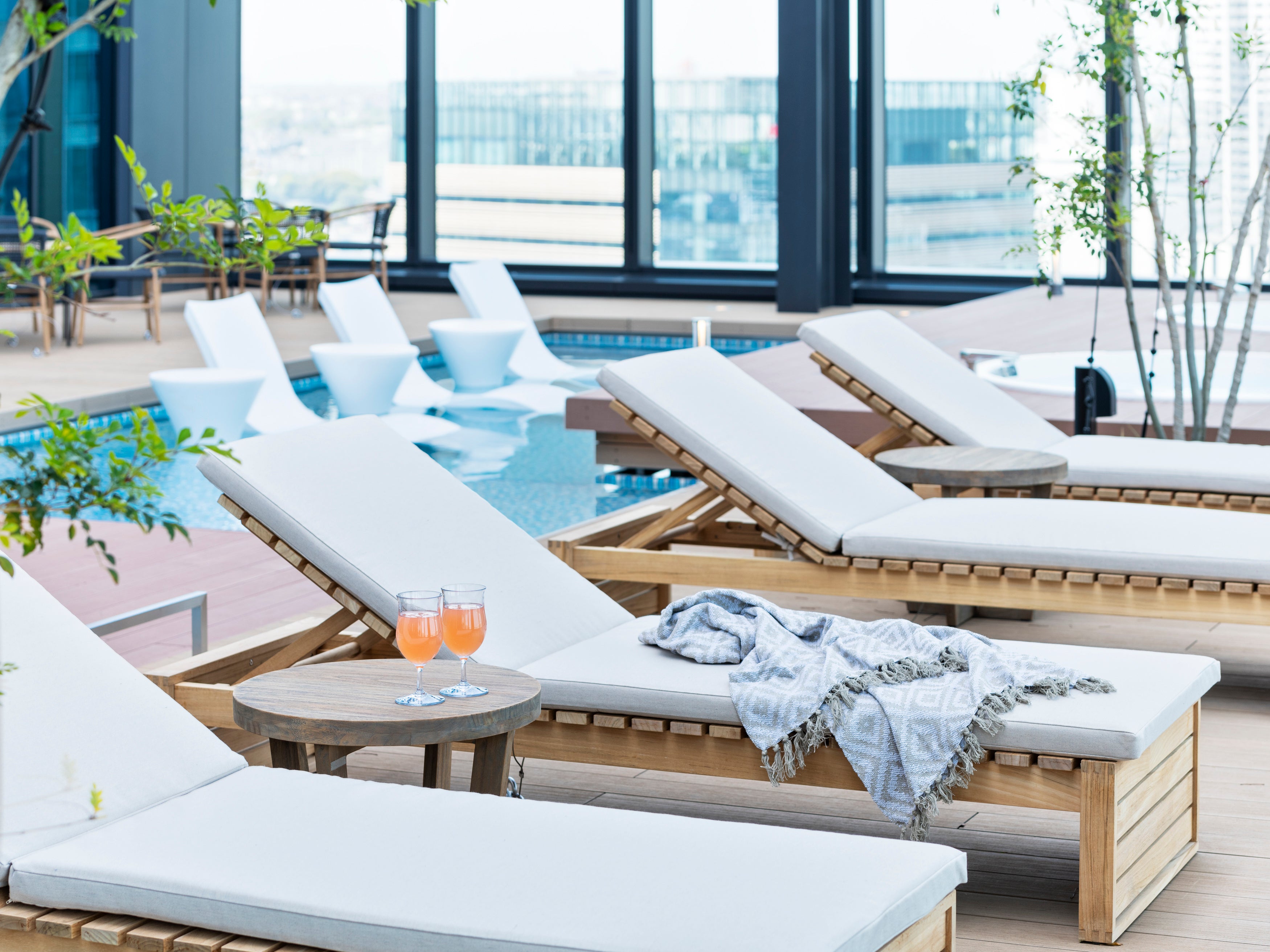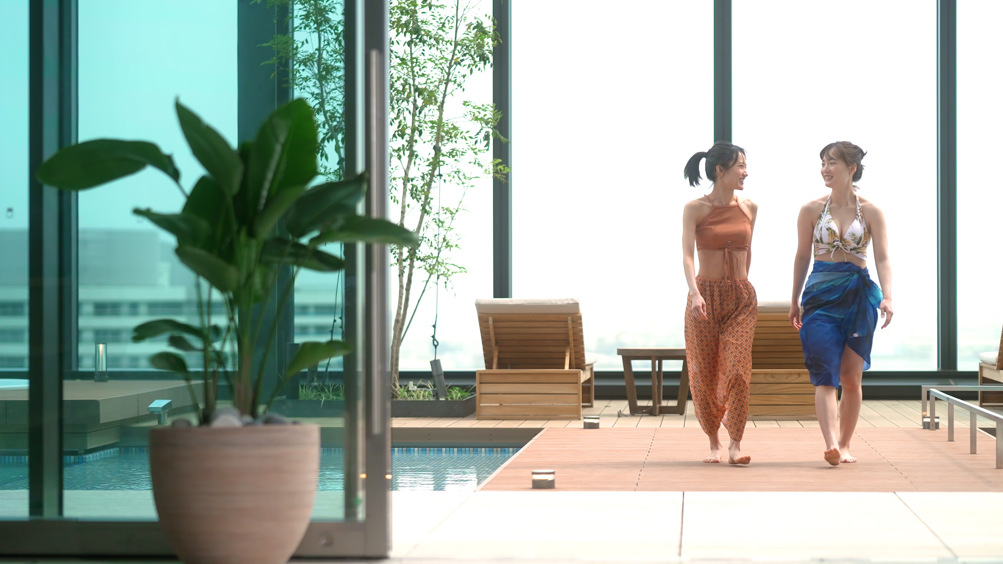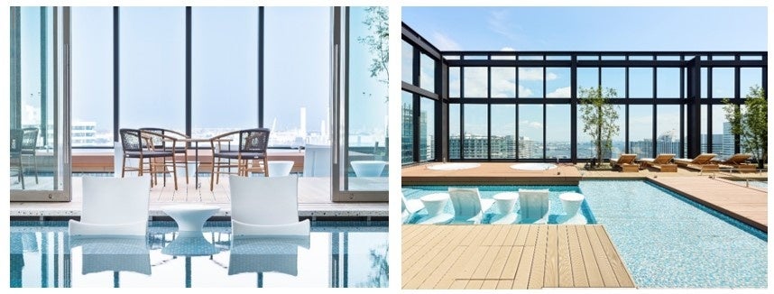 ホテルのアイコニックとも言えるスカイプール「sky pool LA MAGNOLIA(スカイプール ラ マグノリア)」は、三井ガーデンホテルズとして初の設置となるプールで、屋内(全長8.6m、深さ1.2m)・屋外(全長9m、深さ0.5m)の2ヶ所にあり、屋外にはジェットバスも設置されています。プールサイドでは、リトリートのひと時として、バーからドリンク類をご提供します。このスカイプールを自分だけの時間としてお過ごしいただける日中貸切プランを1日1組限定でご用意いたします。