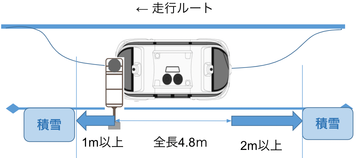 除雪作業により路肩に寄せた雪が走行ルート上にはみ出していると、自動運転バスが障害物として検知してブレーキがかかります。東川町の都市建設課とBOLDLYは、連携して除雪作業を実施するとともに、除雪した雪を十分に路肩に寄せてルートの整備を行います。また安全性を担保できる範囲内で、走行ルート自体をやや中央線寄りに設定する工夫も行います。バス停付近では、自動運転バスが路肩に寄って停車するため、さらに除雪が必要です。下の図の通り、バスの停車位置から横30cm以上、前方1m以上、後方2m以上の除雪を実施し、安全にバス停で停車できる環境を整えます。