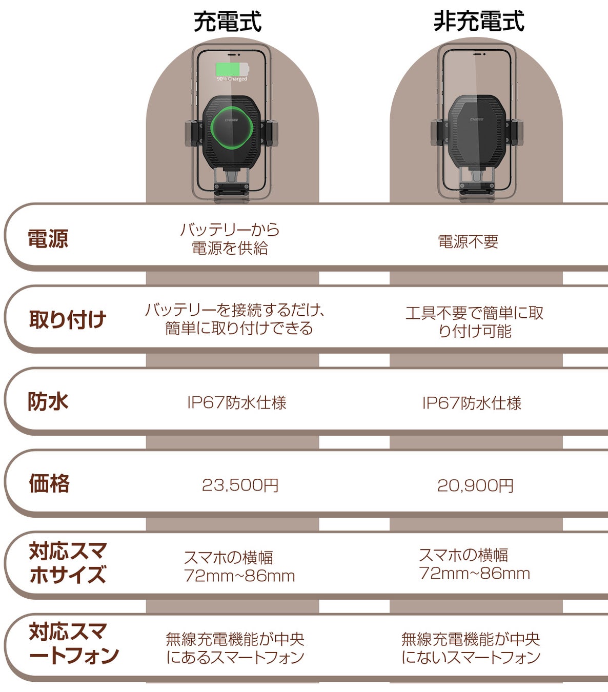 2つのバージョンからお選びいただけます。充電機能付きはバイクに最適で、充電機能のないタイプは自転車やバイクにおすすめです。