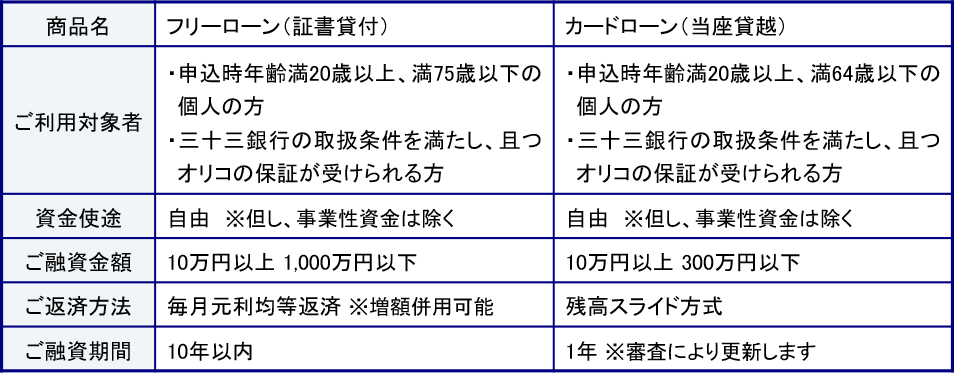 ・申込時年齢満20歳以上、満75歳以下の個人の方 ・三十三銀行の取扱条件を満たし、且つオリコの保証が受けられる方 |
