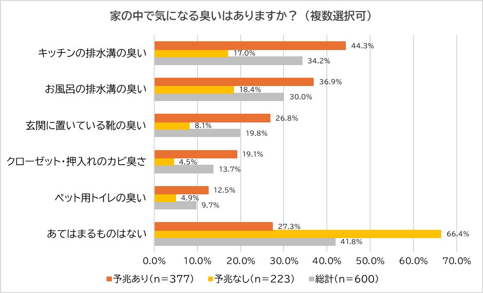 金運ダウンに家の嫌な臭いがどれだけ関係しているのか、金運ダウンの予兆がある377人と予兆がない223人それぞれに「家の中で気になる臭いはあるか?」と訊きました。予兆ありの4割前後が「キッチンの排水溝の臭い」(あり:44.3%、なし:17.0%)、「お風呂の排水溝の臭い」(あり:36.9%、なし:18.4%)と回答しているのに対し、予兆なしはどちらも2割未満と少なく、そもそも気になる臭いに対して「あてはまるものがない」という回答(あり:27.3%、なし: 66.40%)は、予兆ありよりも予兆なしの方が約2.5倍多い結果となりました。