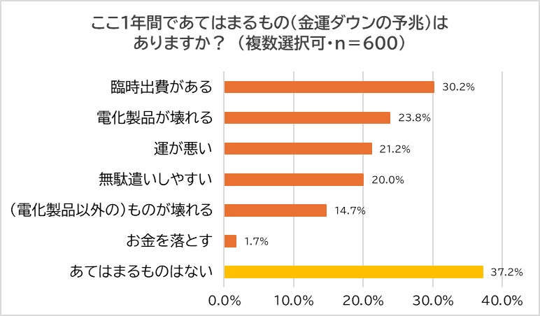 そこで、まず「ここ1年間で、次にあてはまるもの(金運ダウンの予兆)はあるか?」訊きました。4割弱(37.2%)が「あてはまるものはない」と回答しましたが、「臨時出費がある」は3割(30.2%)、「電化製品が壊れる」(23.8%)、「運が悪い」(21.2%)、「無駄遣いしやすい」(20.0%)などは2割以上いました。