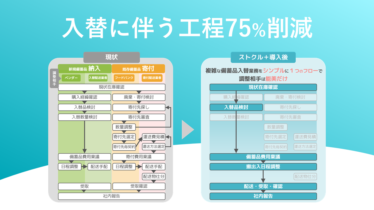 1,備蓄品の新規納入から寄付手続きまでの工程が75%削減