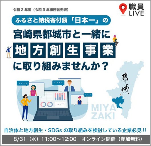 株式会社地方創生テクノロジーラボが主催する、官民連携事業を担当する職員が政策課題や実現したい未来を発信する企業参加型インターネットLIVE配信「職員LIVE」に、都城市が登壇します。