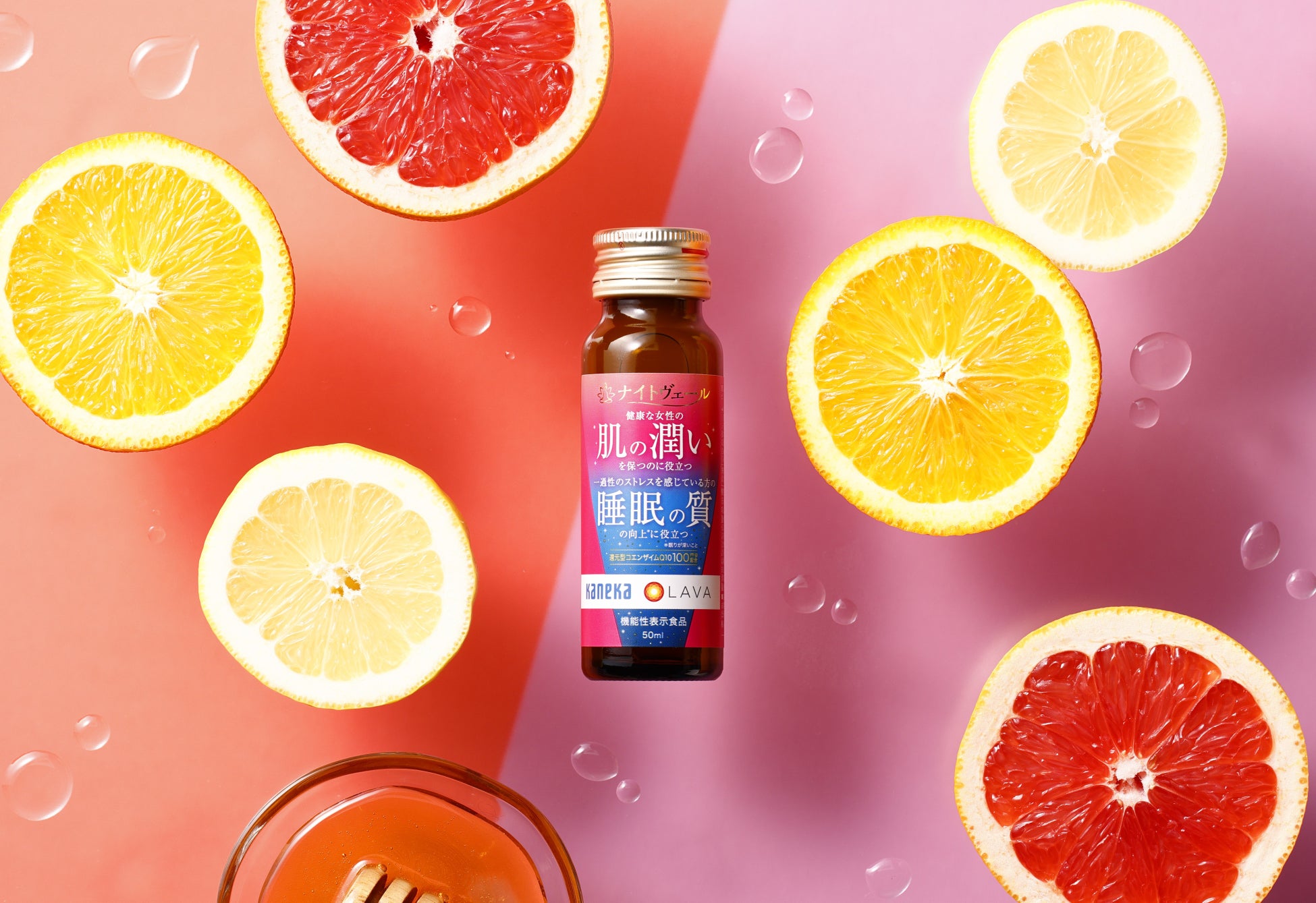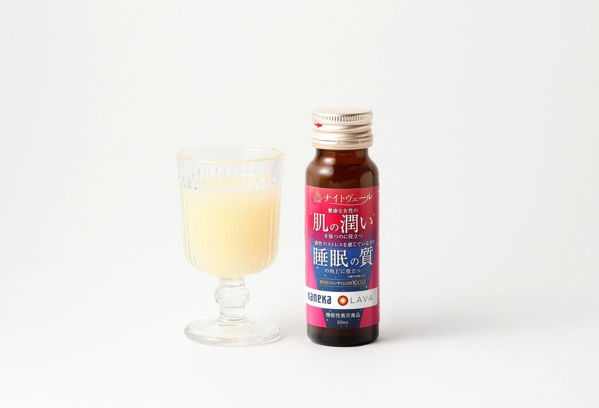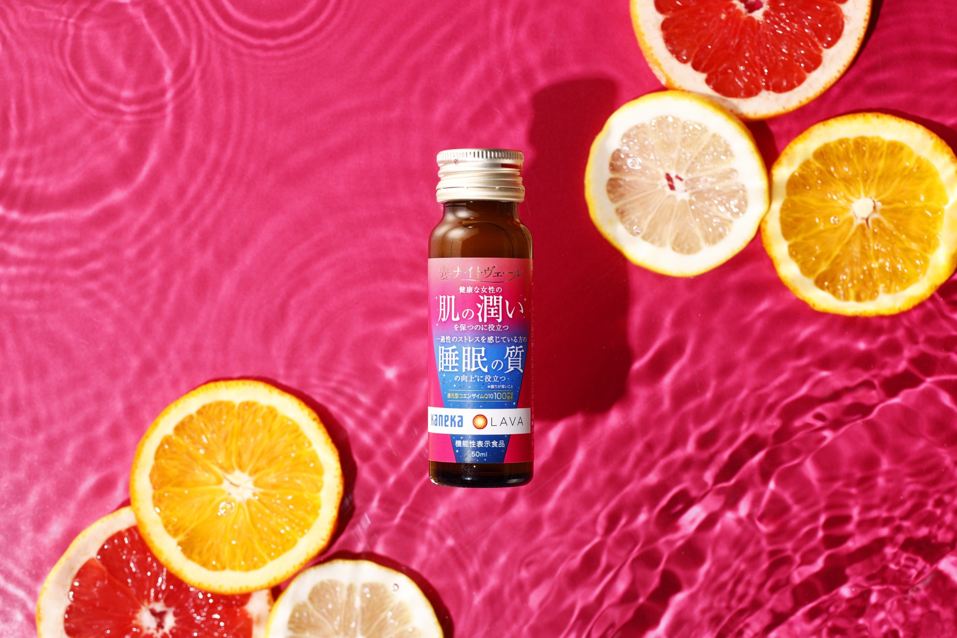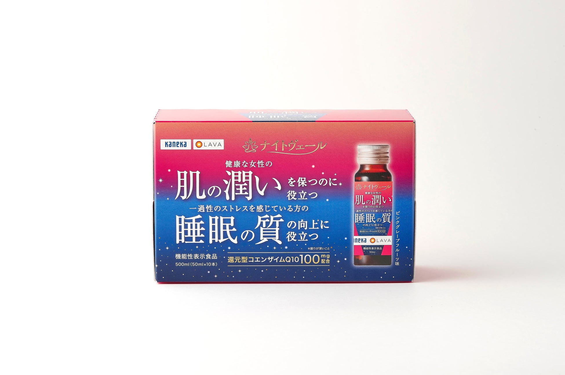 『ナイトヴェール®』は、還元型コエンザイムQ10を配合した、“肌” と“睡眠”にダブルでアプローチする機能性表示食品です。還元型コエンザイムQ10*3は、すでに取得済みの「睡眠の質の向上*4に役立つ」機能に加えて、当社の研究により「肌の潤いを保つのに役立つ」ことが新たに報告されました*5。本商品は、グレープフルーツ・オレンジ・レモンの3種の果汁とハチミツを使用した柑橘のフレッシュさと優しい甘さが特長のドリンクで、「肌の乾燥が気になる」「睡眠の質が悪い」と感じる方に寄り添います。