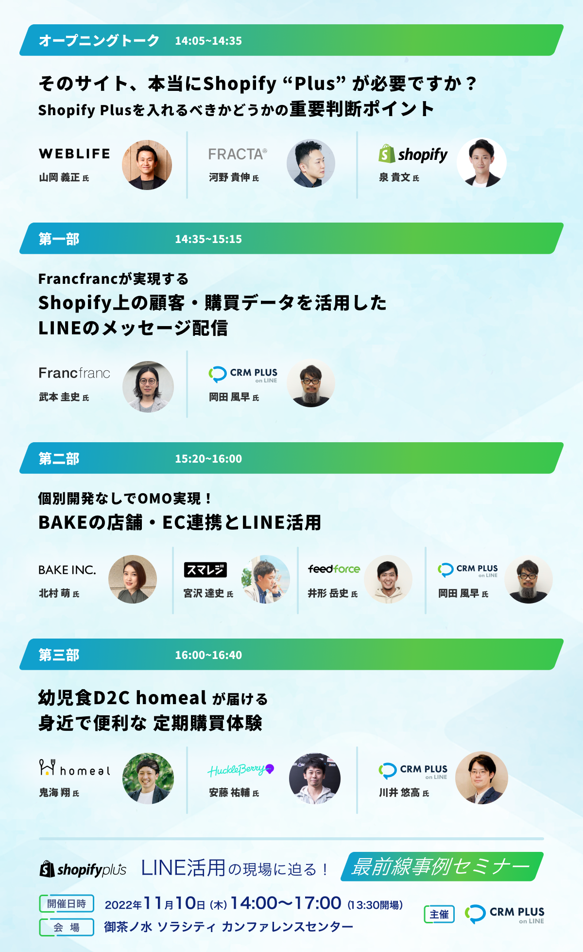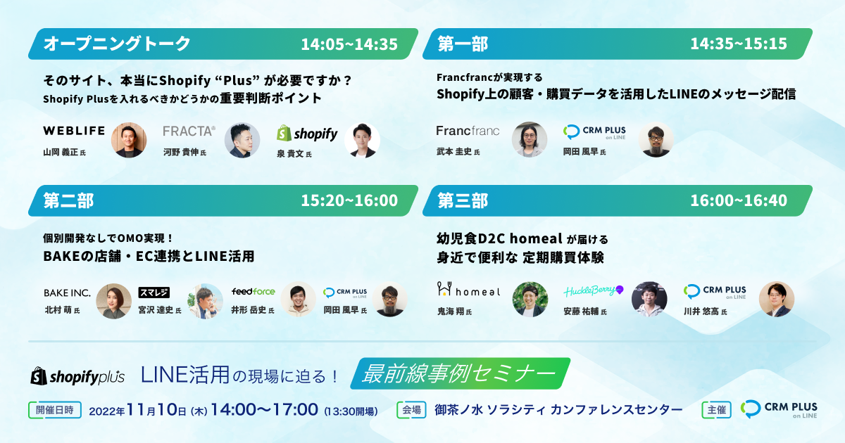 本イベントでは、実際にShopify PlusとLINEの連携活用を積極的に行っている事業社(株式会社Francfranc・株式会社BAKE・homeal株式会社)およびその支援社(Shopify Plus Partners・Shopify Experts)、Shopify Japan株式会社に登壇いただきます。導入時の検討軸から運営上でのチューニングポイントまで、Shopify Plus - LINE活用のノウハウが詰まった3時間をお届けします!