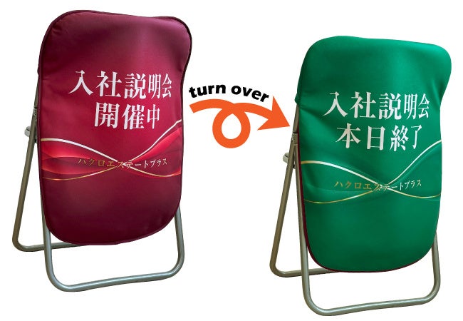 企業説明会の受付ブースでは、「受付中」のデザインで案内を行い、終了後には「受付終了」のデザインに簡単に変更可能。受付終了用のサインを別途準備する必要がなく、荷物の運搬も軽減できます。