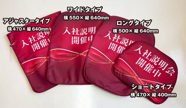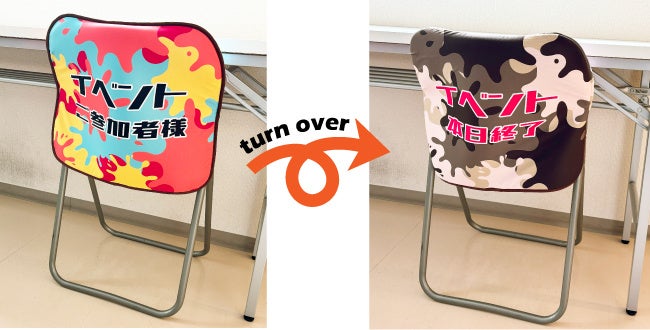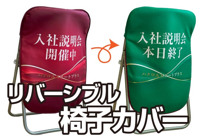 会社説明会や展示会、商談会で活躍する椅子カバーは、ブース装飾には欠かせない商品です。ブースを目立たせるだけでなく、企業の個性をアピールすることで、他社との差別化もしやすく来場者にとっても判断しやすいブースになります。その椅子カバーに新しくリバーシブルタイプが登場しました。1枚で2つの異なるデザインを持つリバーシブル仕様。状況に応じて表裏をひっくり返すだけで、メッセージを簡単に切り替えることが可能です。