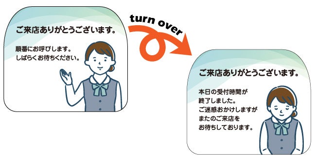 カフェやレストランでは、表面を「利用可能」、裏面を「予約席」として使用可能。お客様がスムーズに席を見つけられるようになり、店内案内の効率が向上。結果として、顧客満足度の向上にもつながります。