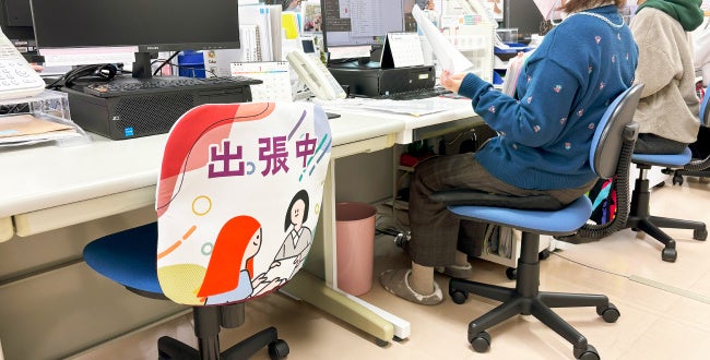 オフィス内では、椅子カバーの表面を「出張中」、裏面を「会議中」として使用。不在の理由が一目で分かるため、確認の手間を省けます。また、チームメンバー間の連携が円滑になり、業務効率や社内コミュニケーションの向上にも貢献します。