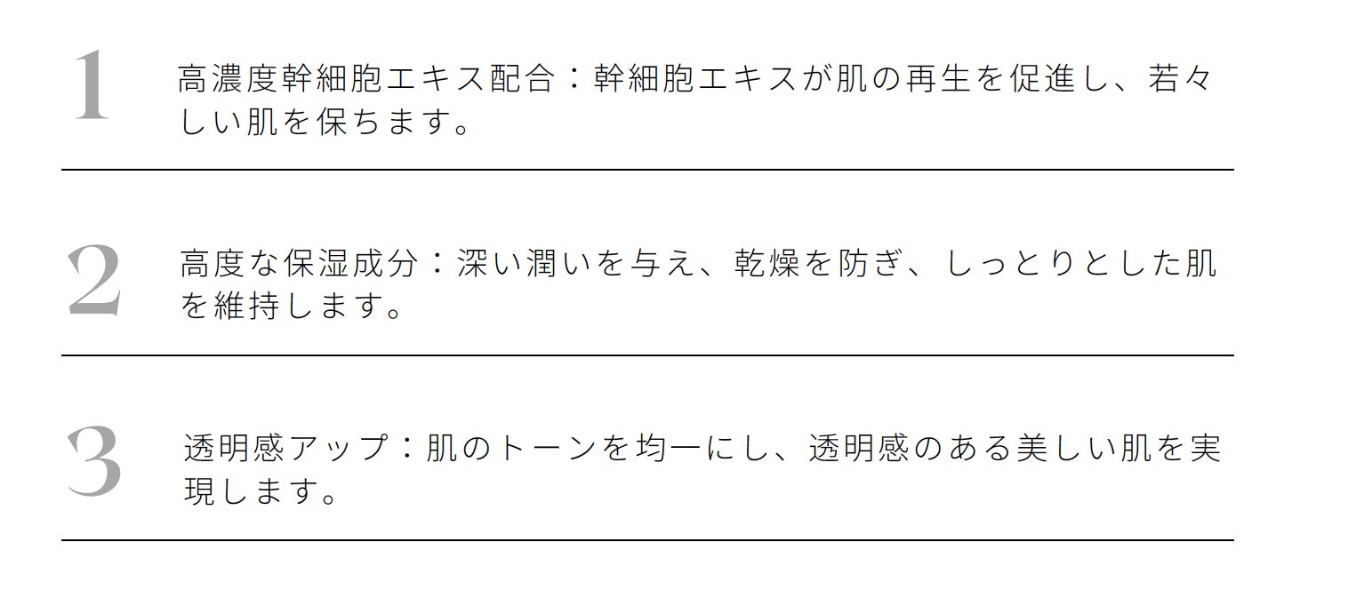 ○幹細胞培養液⾼配合:化粧⽔としてこれまでにない原液レベルの幹細胞培養液有効成分10%配合。