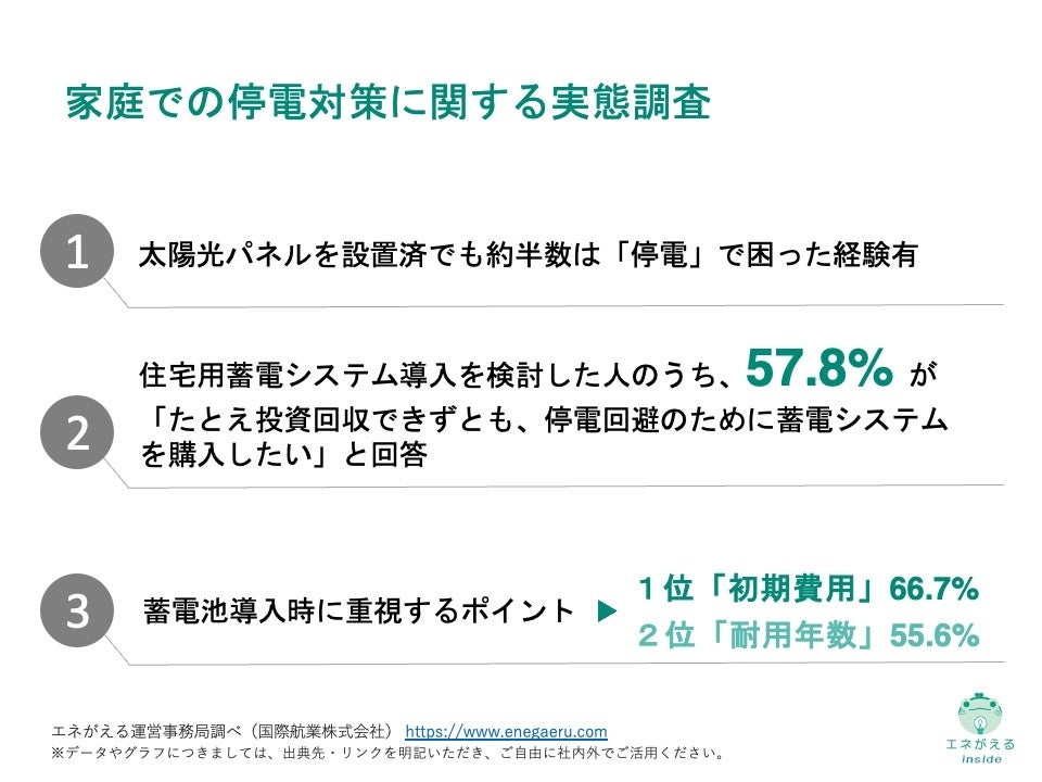 [独自レポートVol.7]【9月は防災月間!家庭での停電対策を調査】太陽光パネルを設置済でも約半数は「停電」で困った経験有。3人に1人が家庭の停電回避対策として年間「5,000円以上」支払い可能と回答