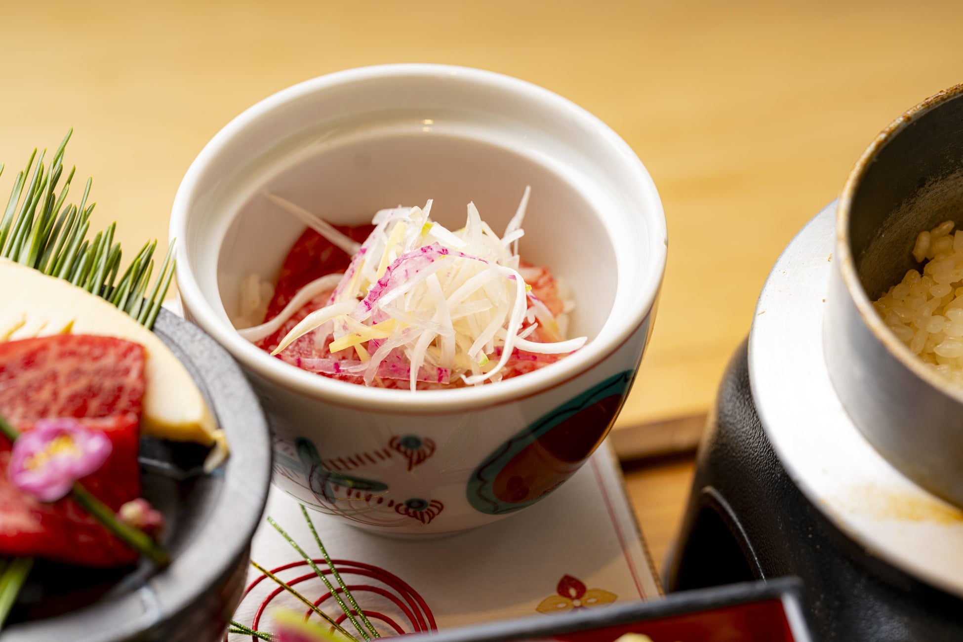 鰹と昆布で香り高く出汁を引き、赤身肉ならではの濃い旨味を味わえる、