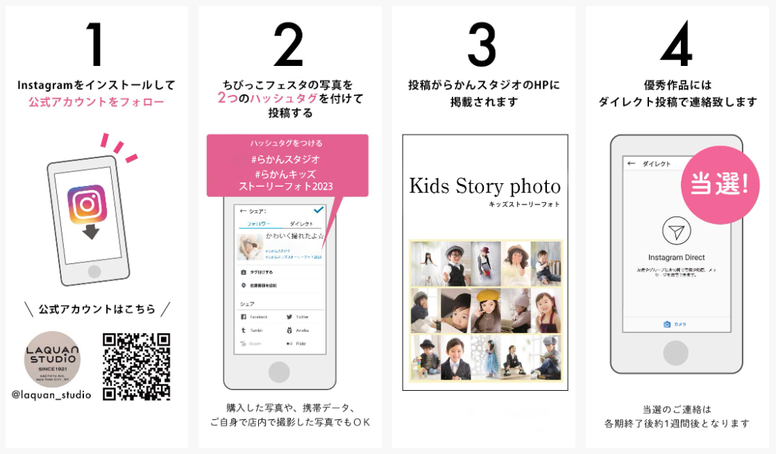 さらに「キッズストーリーフォト」ではインスタグラム投稿キャンペーンも実施。「#らかんスタジオ」「#らかんキッズストーリーフォト2023」のハッシュタグをつけて撮影した写真をインスタグラムに投稿していただくと、抽選で10名様に、フレーム1つと七五三撮影で使える割引券をプレゼントします。