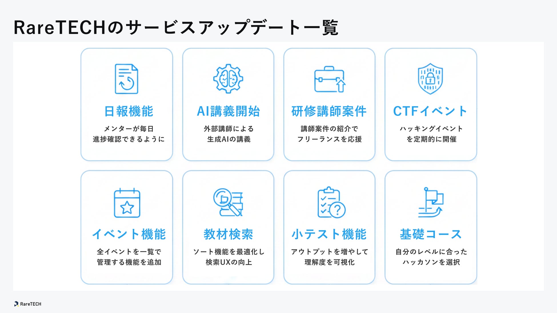 これらのアップデートを通して、RareTECHは単なる教材を提供するサービスに留まるのではなく、企業に求められるエンジニアを目指すための総合的な教育プラットフォームへと進化し続けています。