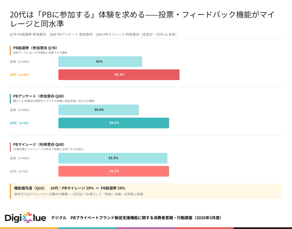 ◼ 20代は「PBに参加する」体験を求める——投票・フィードバック機能がマイレージと同水準