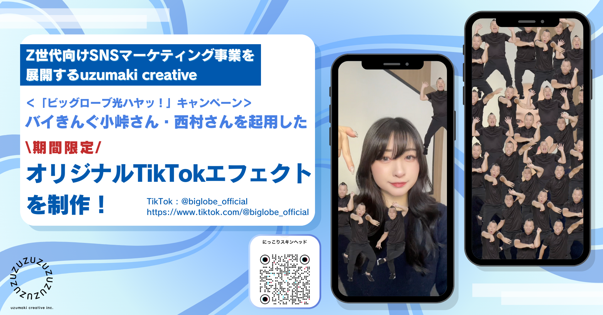 SNSマーケティング事業を展開するuzumaki creative<「ビッグローブ光ハヤッ!」キャンペーン>バイきんぐ小峠さん・西村さんを起用した期間限定オリジナルTikTokエフェクトを制作!