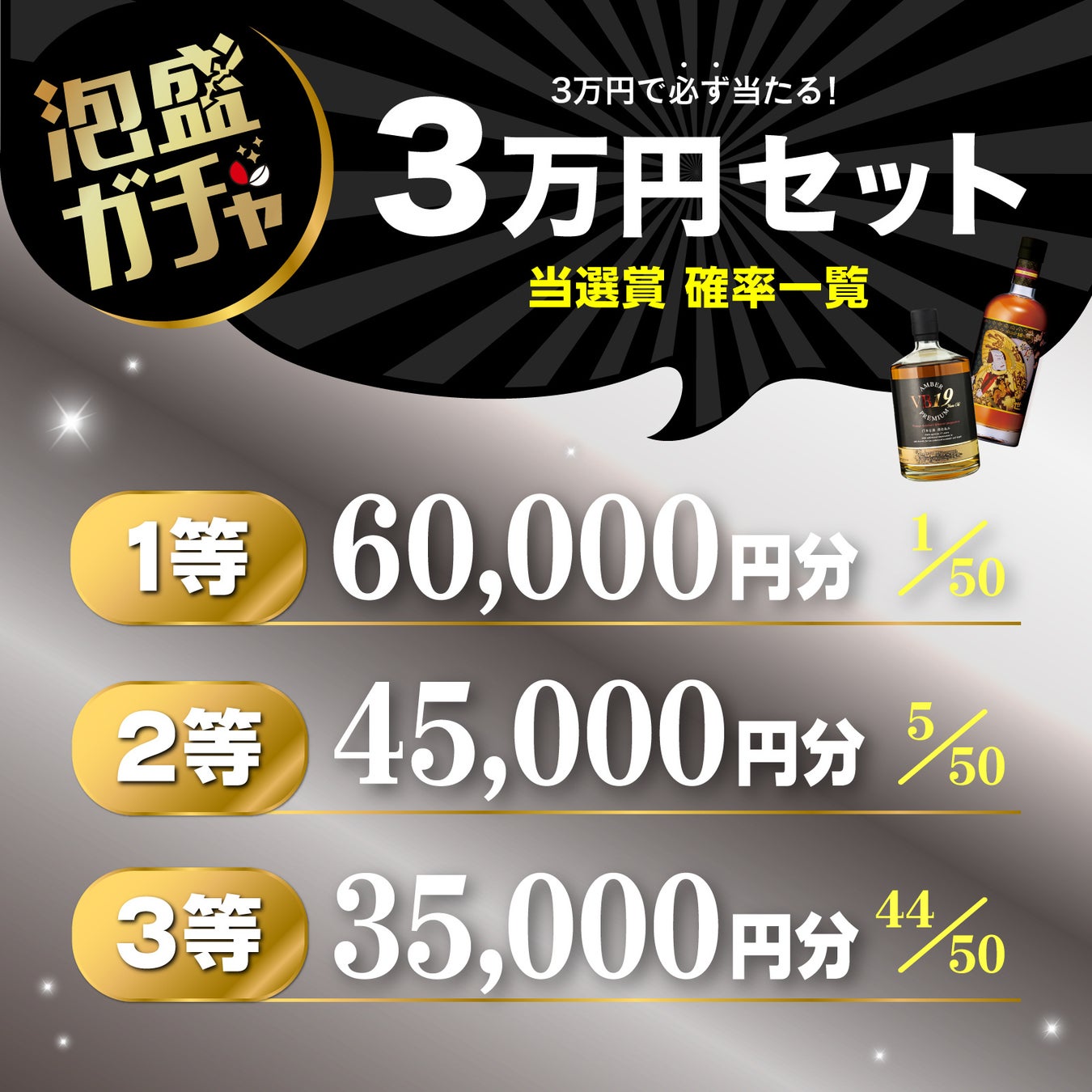 3万円で最大6万円分のお酒が当たるプレミアムガチャは、限定50セットをご用意。なかなか手に入らない商品が当たるかもしれないレアなセット内容です。