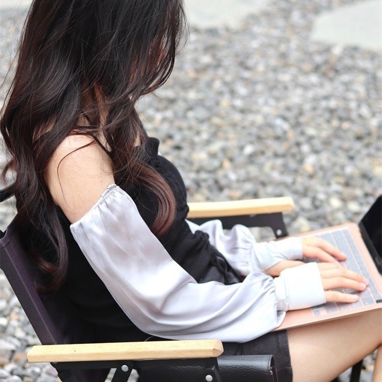 吸湿性が高く、高級感のある光沢をもつレーヨン製の日除けスリーブです。ブラウスの袖のような上品なシルエットと相まって大人な雰囲気をまといます。袖口の可愛い刺繍がアクセントです。