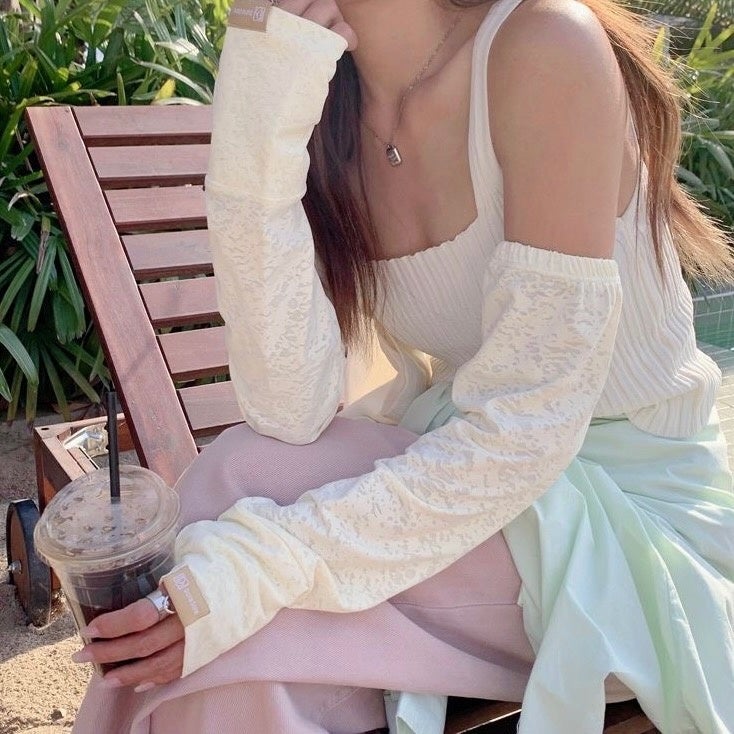 レースのようなさりげない透け感がオシャレな日除けスリーブです。フェミニンなシルエットでふんわりとした柔らかな雰囲気をまといます。