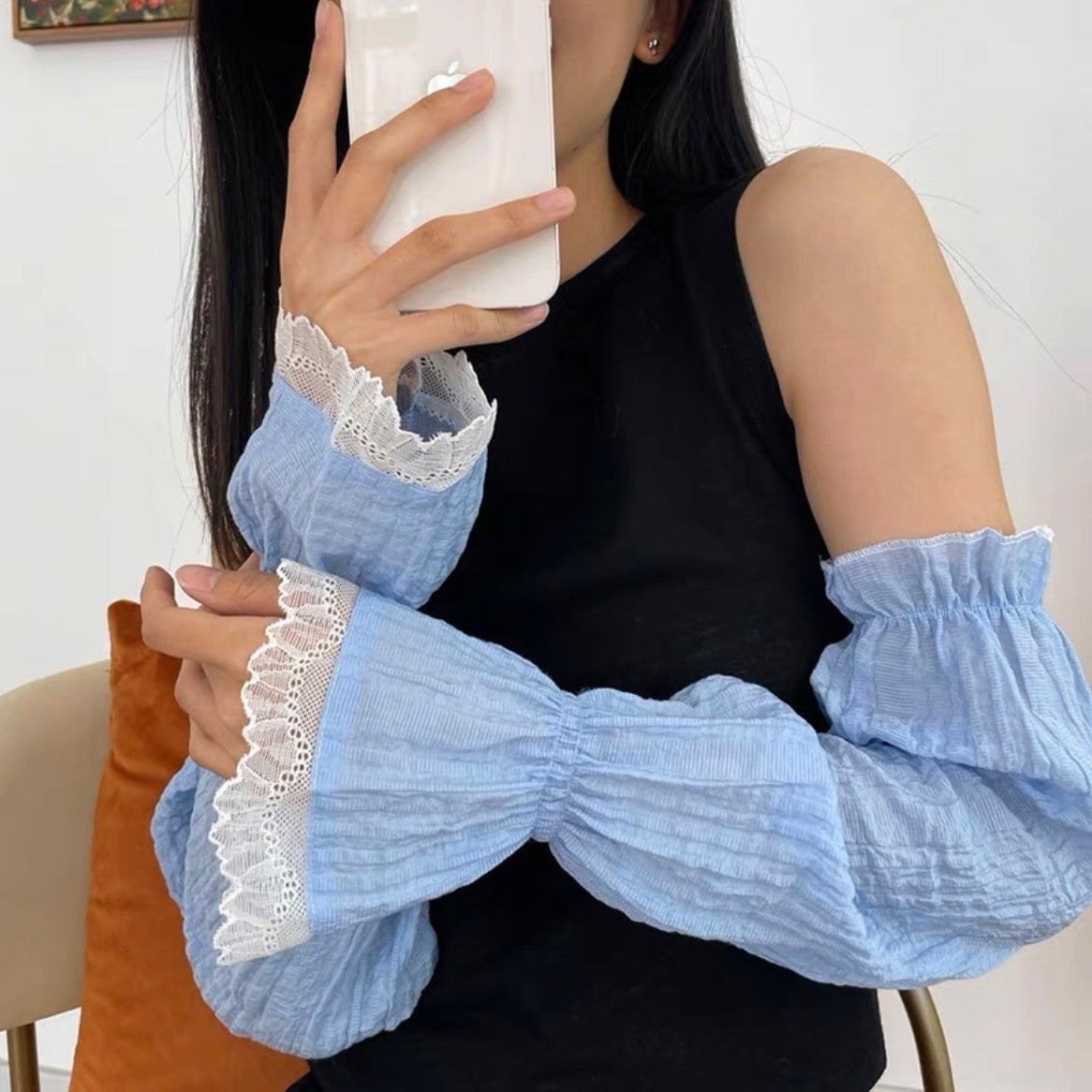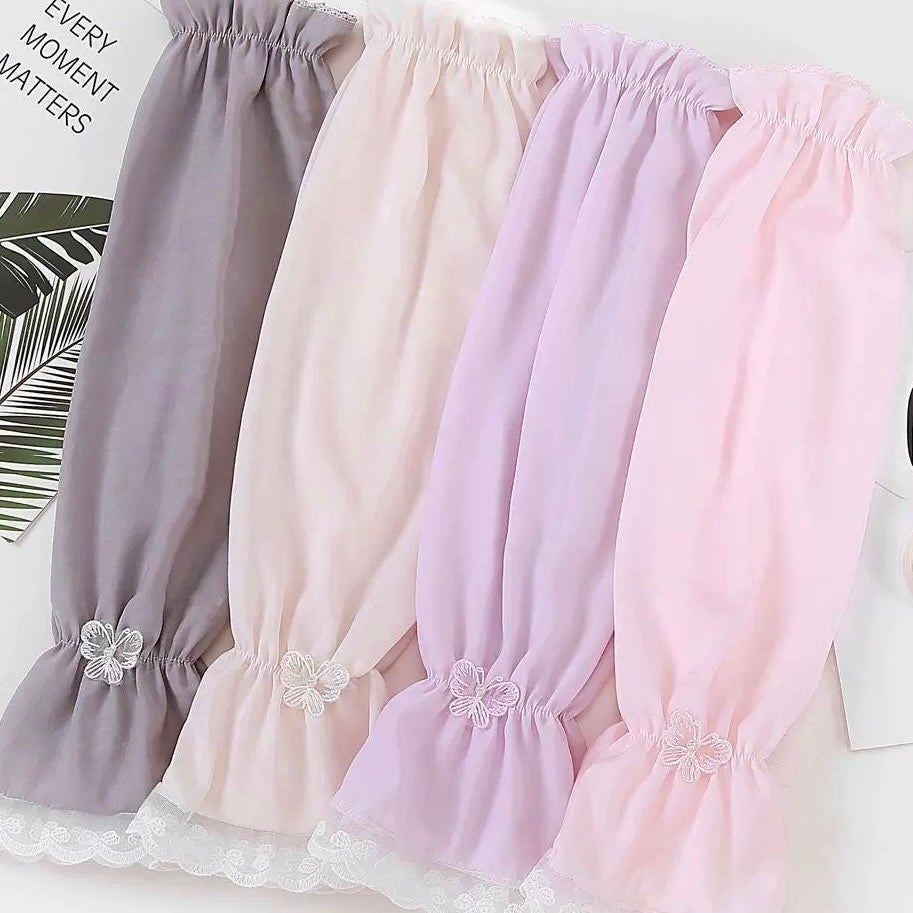 ふんわりとしたシルエットが特徴の、フェミニンな日除けスリーブです。袖口のレースが可愛く、コーデの雰囲気も崩しません。毎日使っても飽きのこない大人可愛いデザインです。