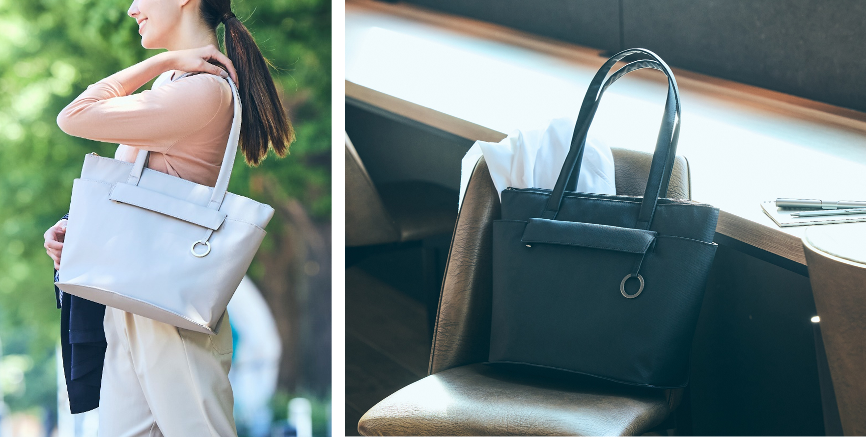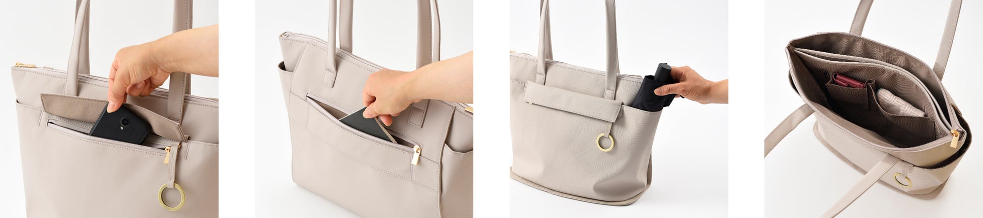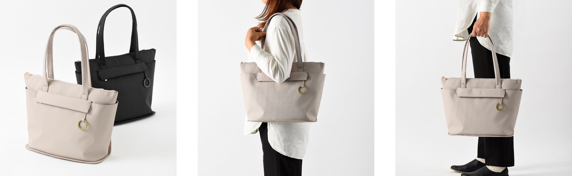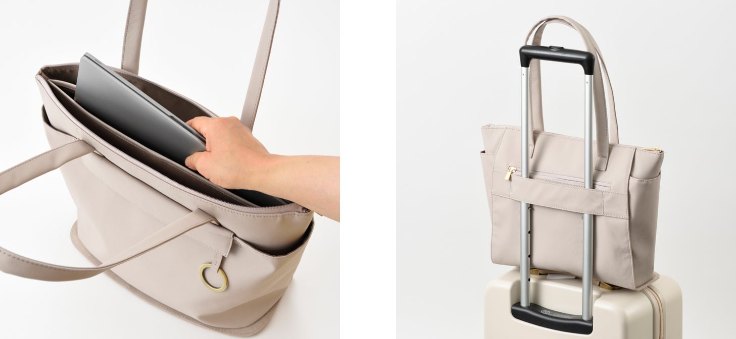 外側、内側ともにポケットを充実させた収納力抜群なトートバッグ。スタイリングしやすいベーシックカラーであるグレージュとブラックの2色展開。背面にはキャリーケースのハンドルを通せるループベルト付きで、出張時にも安心です。