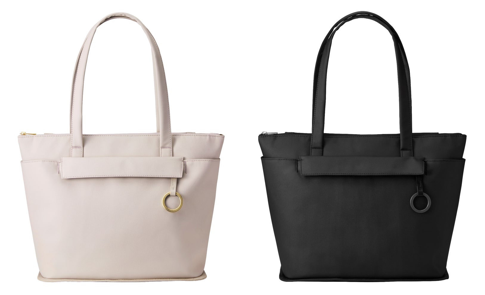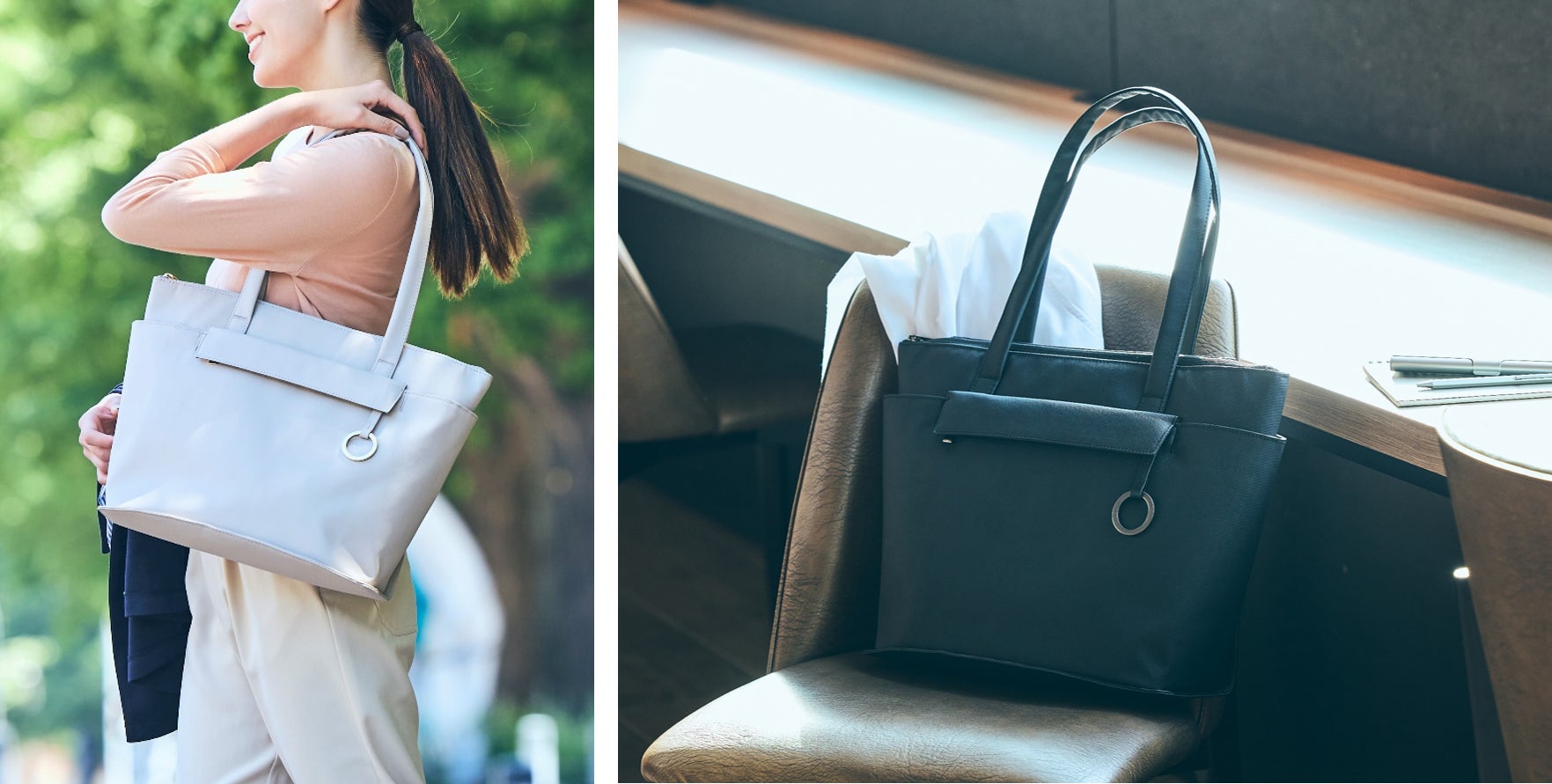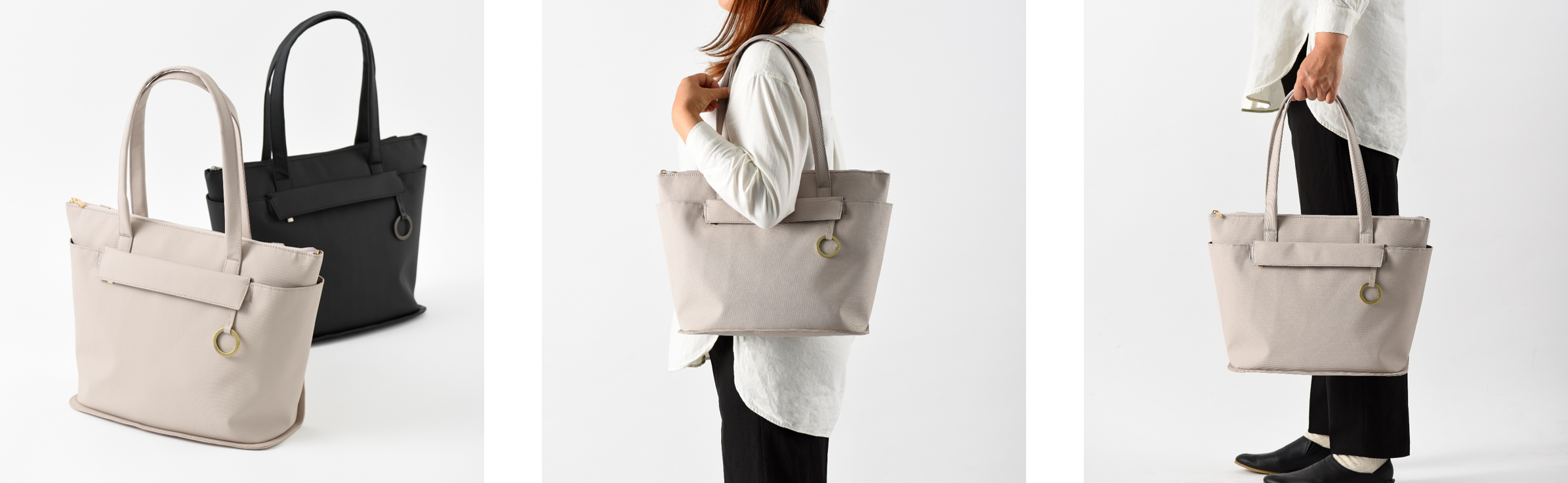 外側、内側ともにポケットを充実させた収納力抜群なトートバッグ。スタイリングしやすいベーシックカラーであるグレージュとブラックの2色展開。背面にはキャリーケースのハンドルを通せるループベルト付きで、出張時にも安心です。