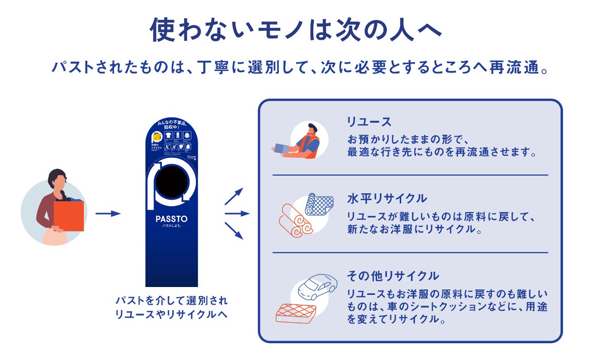 「PASSTO」は、“PASS TO”を短縮した造語で、「次の人に渡す・未来につなぐ」を意味しています。生活者の身近な場所で資源循環の入口となり、不要品の回収から選別、再活躍させるリユース・リサイクルまでの一連の循環モデルを提供しています。衣類のリユース・リサイクル率は約98%を誇り、単純焼却と比較してCO2排出量の削減にも貢献。資源が循環する社会づくりを推進しています。