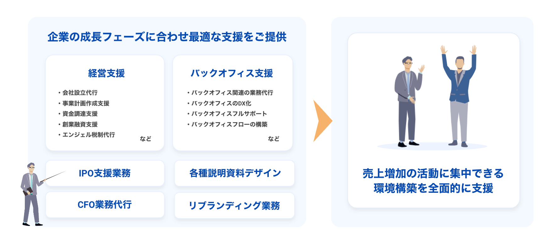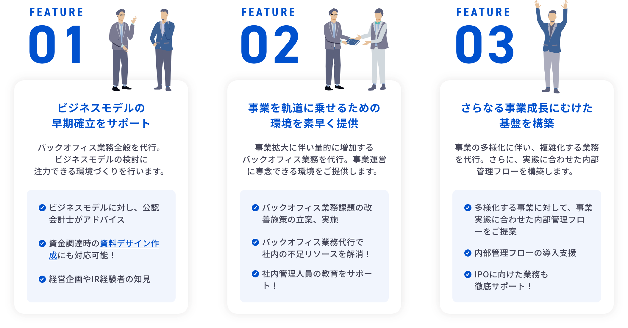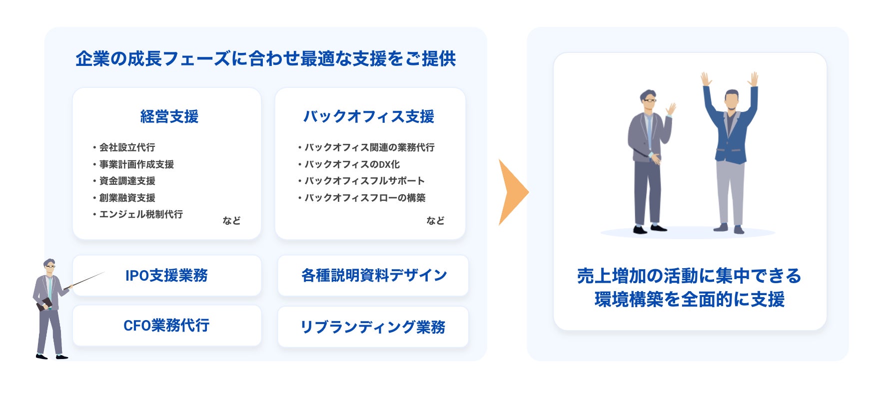 バックオフィスからビジネス推進を支えるパートナーとして、ビジネスモデルの早期確立サポート、事業を軌道に乗せるための環境提供、さらなる事業成長にむけた基盤構築、のような経営課題に向き合い伴走型のサポートも特徴のひとつです。