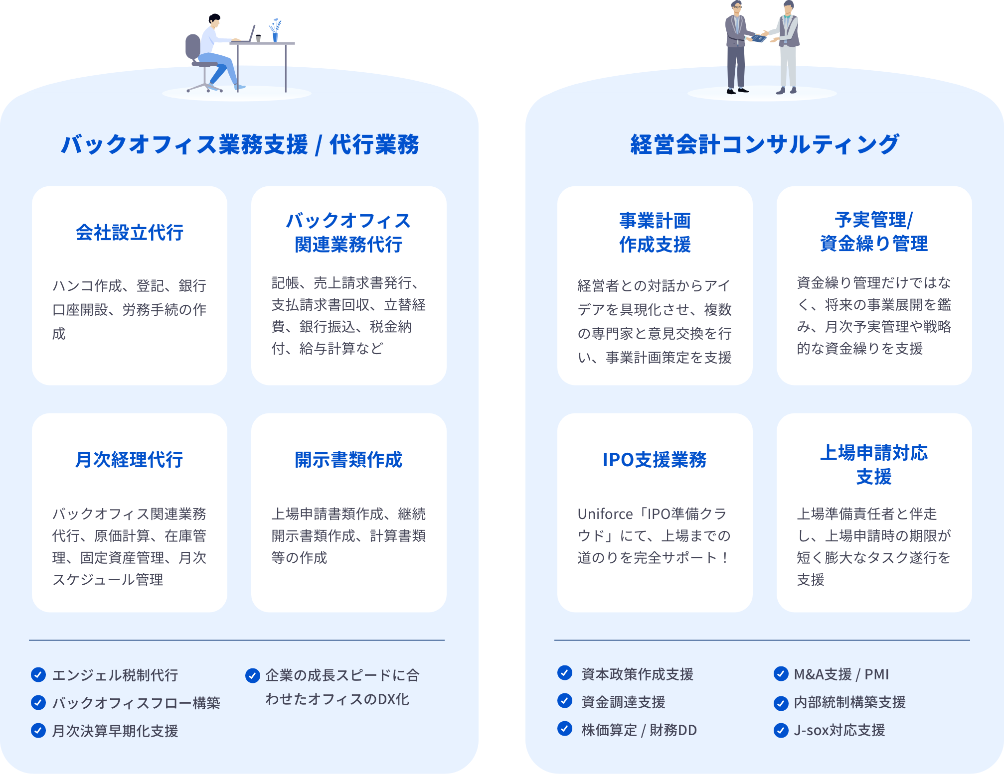 このような課題に対して、当社の強みである20名を超える「監査法人出身の公認会計士」が、一般的なバックフィス支援だけではなく、ビジネスの成長、安定化に向けた体制構築を徹底的にサポートして参りたいと考えていたからです。