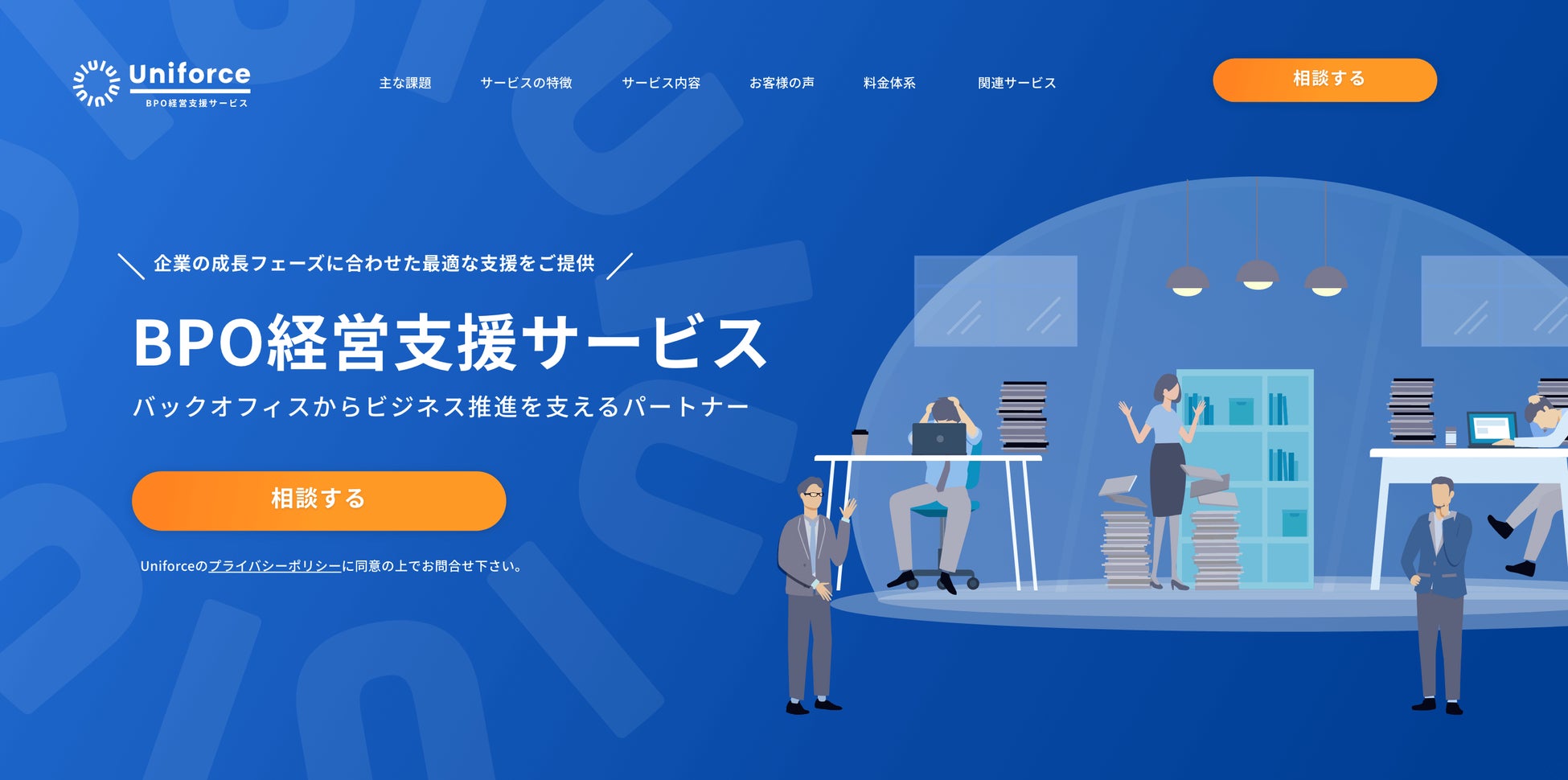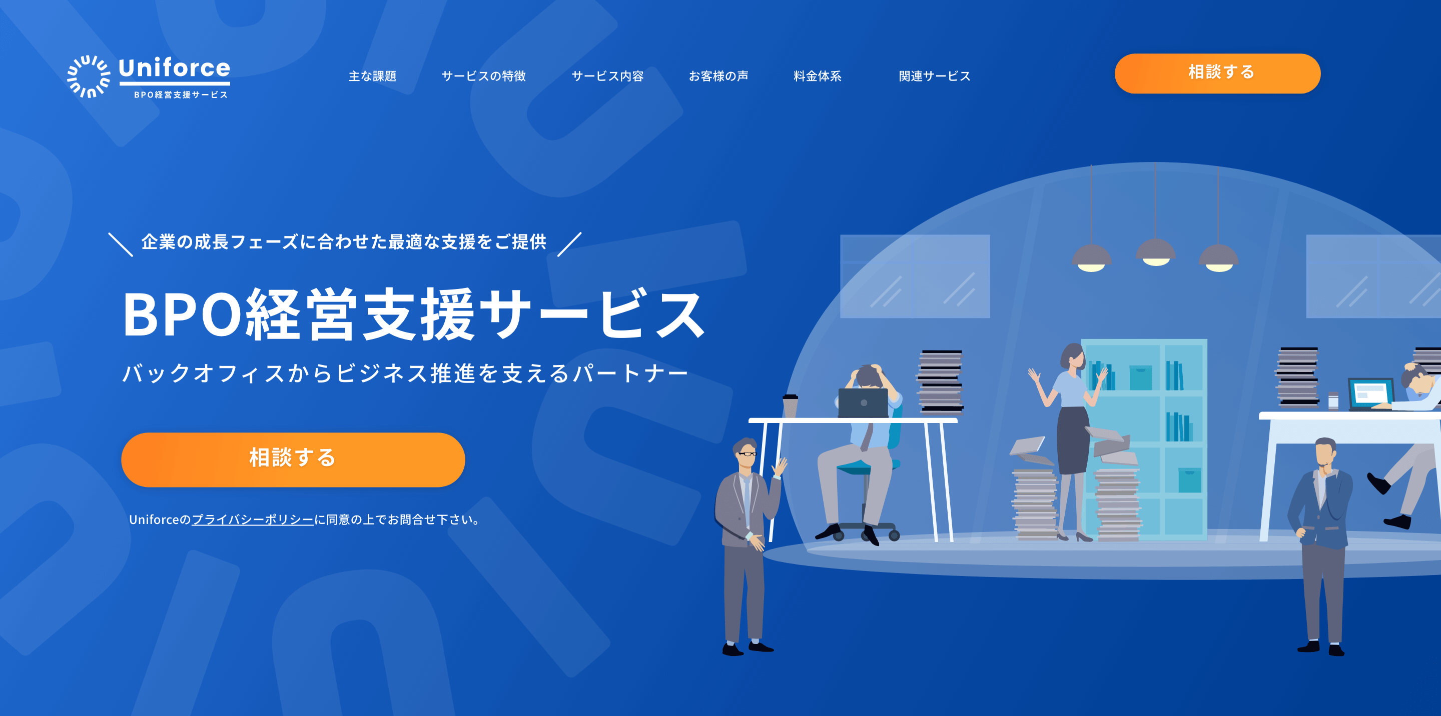 「Uniforce -BPO経営支援サービス- 」の特徴は、企業の成長フェーズに合わせ最適な支援をご提供し、売上増加の活動に集中できる環境構築を全面的な支援をさせていただけるところです。