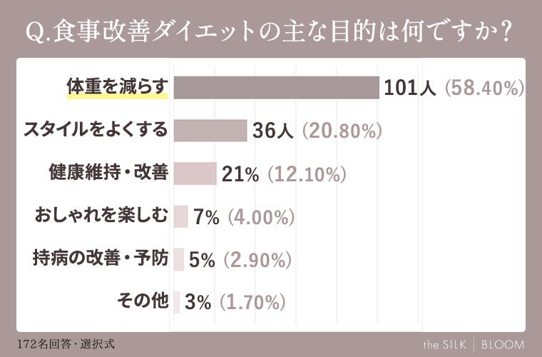 食事改善ダイエットの主な目的は、「体重を減らす」が58.4%と最も多く、外見磨きのためという方が多い一方で、健康的な体づくりを目指す人もいます。